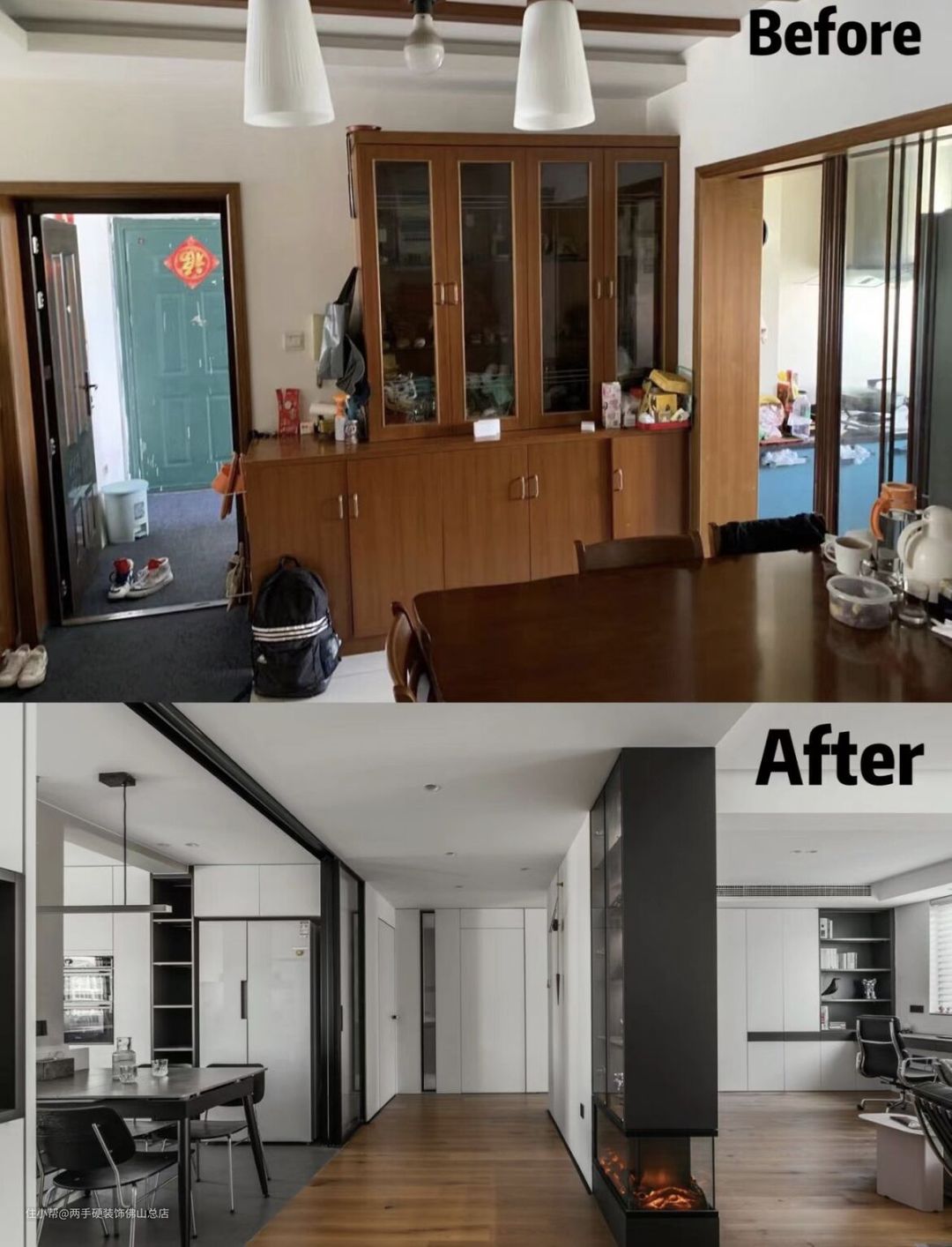 餐厨区改造前后对比 餐厅和厨房原来的面积也不大,业主平时下厨还挺多的,所以餐厨区整体利用率还挺高,改造后餐厨空间变成了开放式的布局,还设计了中岛,视觉上和使用感都不错。