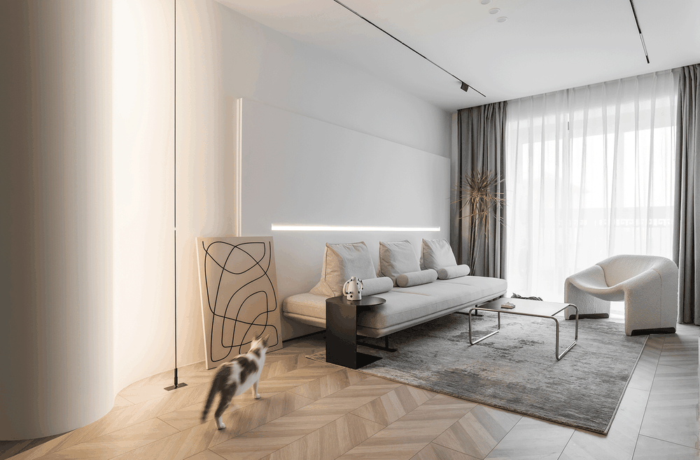 客厅造型这一块,我们用了一个纯白色的长方体作为背景装饰。 长方体的中间的位置做了独特的内凹四分之一的圆弧, 小圆弧的下方有一个线形灯往上打,灯光溢出的感觉特别棒! 天际线灯+内凹圆弧,线形灯+外凸圆弧, 通过灯光与造型的设计营造整个客厅空间的趣味性和层次感。