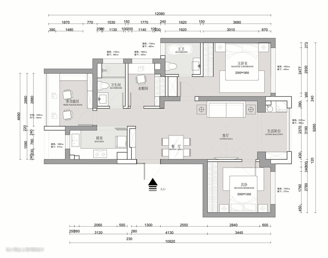 另一个比较大的改动是主卧的进门位置,原来的主卧进门位置从客厅沙发背后的墙面进去,动线长且复杂,而且会影响客厅区域的整体性,因为我们想打造一个更开阔的居住体验,把主卧和小房间整合为一个房间,主卧入口从原来的小房间进入,原小房间位置作为衣帽间和化妆使用。