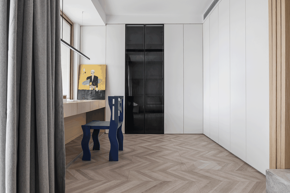 书房的移门采用4扇联动移门,打开的时候移门缩进凹槽内,移门完全隐藏起来,这样书房和客厅就有了互动,一人在客厅和猫咪玩耍,一人在书房办公,就算彼此不说话,两人的磁场也会连接的更紧密。关闭的时候,未来可以作为一个独立的房间临时居住,独特的斜拼木纹的移门样式,给空间增加了一些温暖的氛围。 两米二长度的书桌,也可以满足两人同时办公,书桌下方靠里侧的区域,做了一个开放柜,本来是用来储物的,但是猫咪特别喜欢在这里趴着。