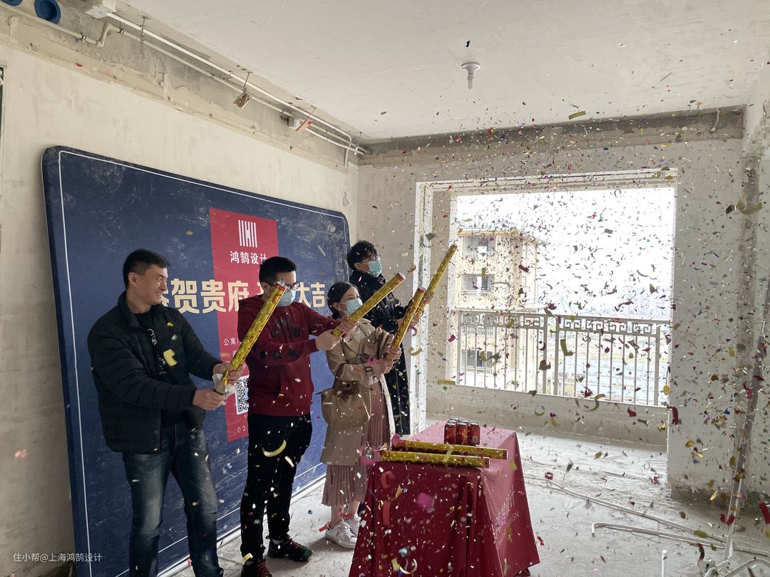 把精装房还原成了毛坯状态,开工现场拍了一张纪念照片, 左至右依次为项目经理刘海宁、业主夫妻、设计师张从