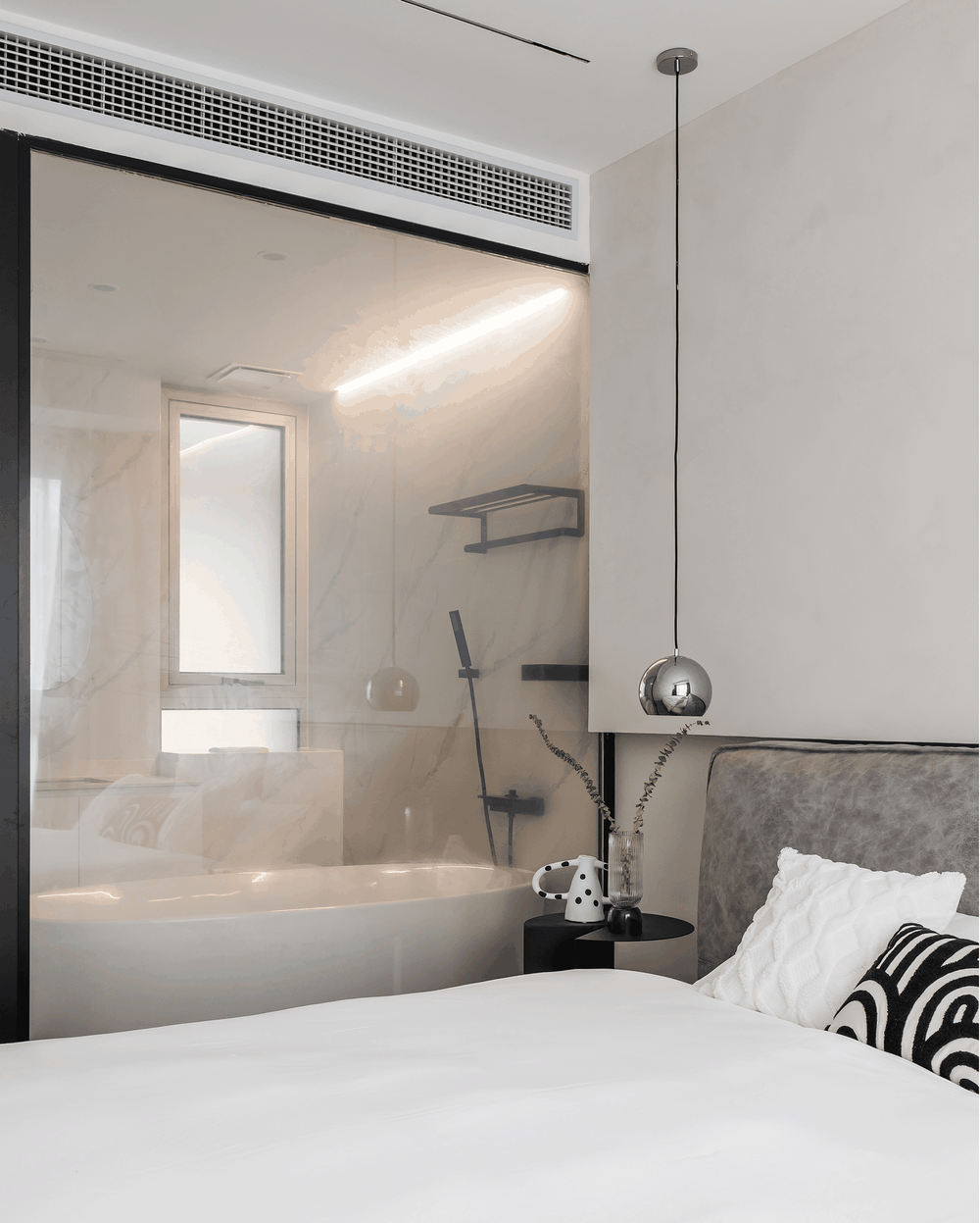 主卫的原墙面拆除,用电动雾化玻璃作为替代,增加采光,这样主卧区域就有了3扇窗户,采光和通风都得到了改善。 主卫区域设置了一个浴缸,业主很喜欢泡澡,可以冲走一整天的疲惫,整个空间更年轻化,我们当时选浴缸选了很久,才找到心仪的样式。