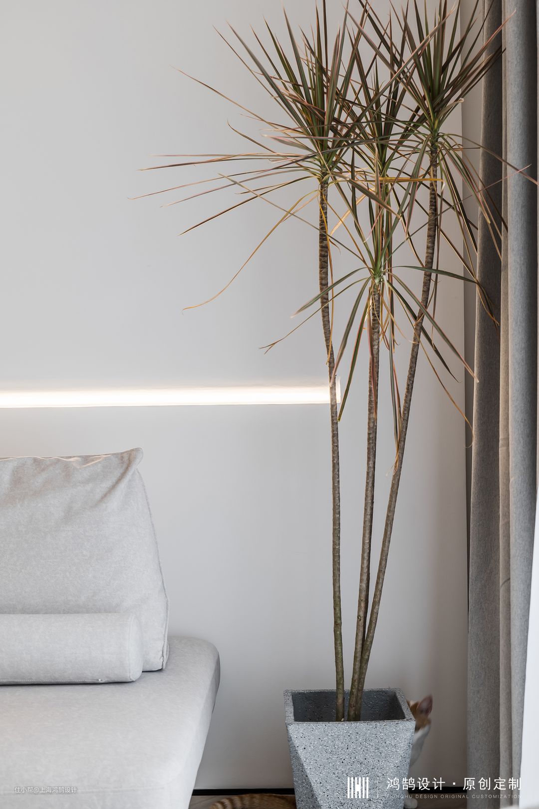 为了让这一块更有趣一些,用了一根常用在顶面上的天际线灯,在墙面上垂直使用,天际线灯的灯光打向圆弧的内凹面,氛围感特别有趣。