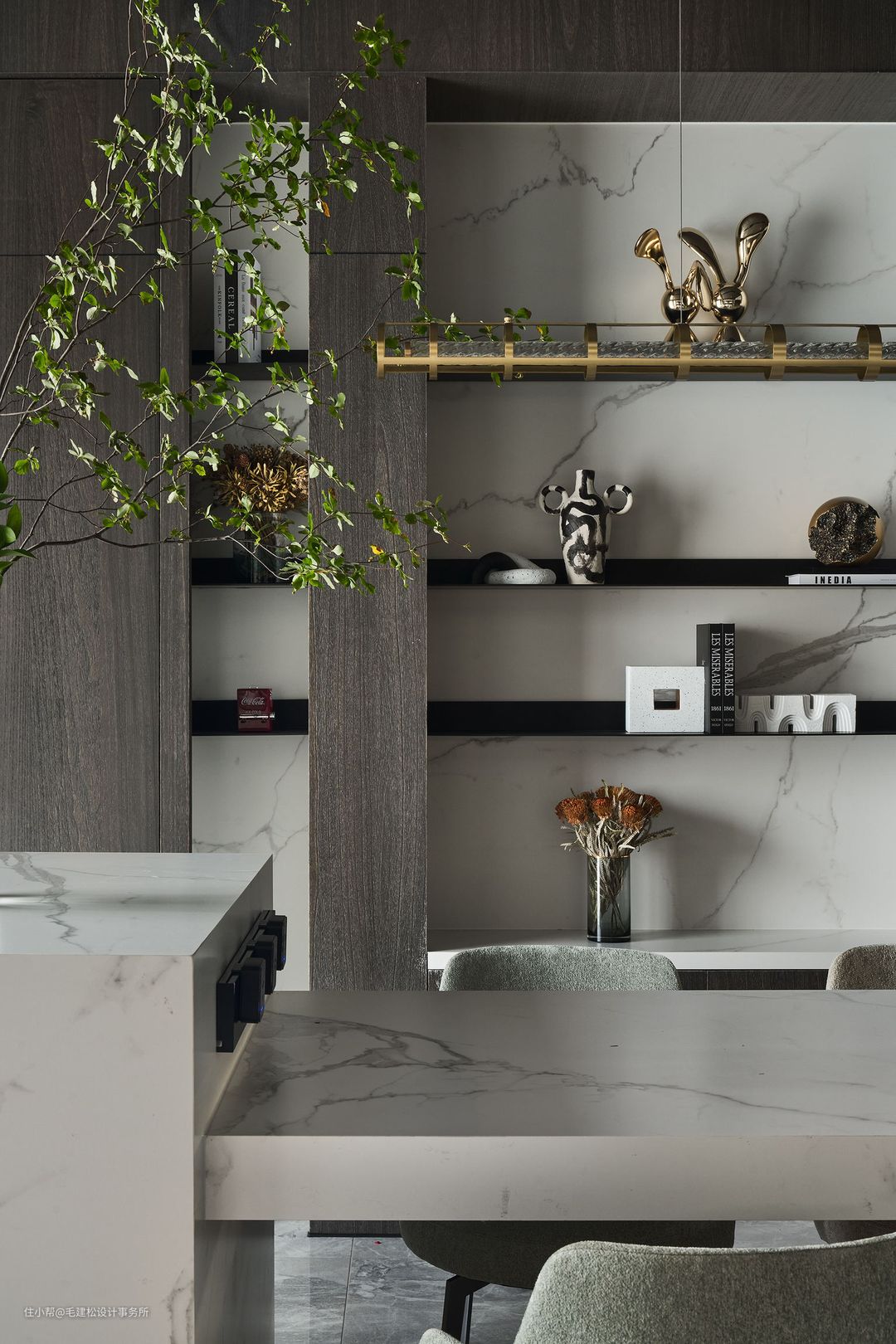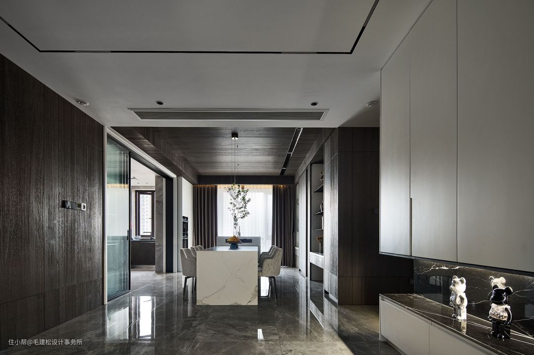 空间墙面与顶面统一使用深色木饰面装饰,白色大理石岛台与餐桌组合定制,轻奢氛围感自然流露...