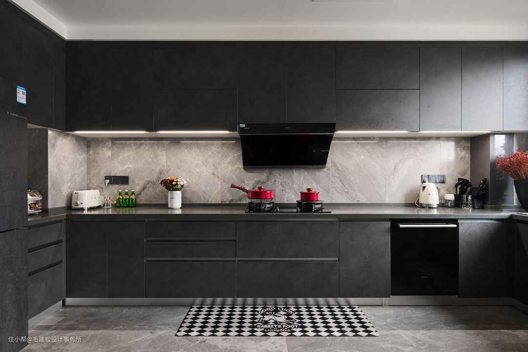 U型橱柜的设计,从清洗到备餐到烹饪,合理的动线设计为厨房带来更流畅的体验感。 碳黑色面板,石英石台面,经典的大理石地面,即使沾染了生活里的烟火气,依然优雅动人。