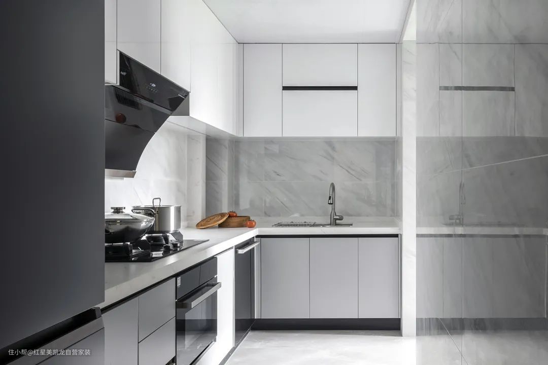 挪空间打造宽敞洗漱台 厨房采用黑白灰色调,墙面不规则、斑驳的纹理营造空间的个性基调,同时提升了整体质感。