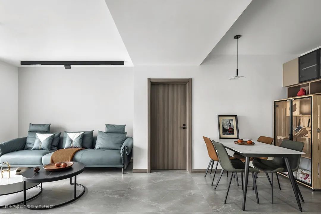 客厅与阳台地面同样采用没有“边界”的处理方式,地砖通铺有效缓解区域的局促感,让空间更加舒展。
