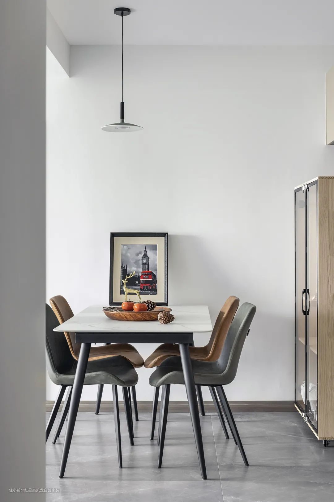 大理石餐桌+皮质座椅,为餐厅添上一抹高级雅致的韵味,利用不同的材质,丰富用餐氛围感。