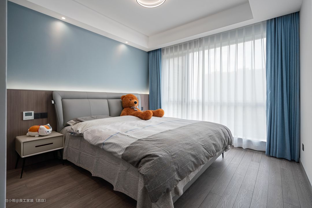 干净利落的蓝色系将空间完全地进行了属性划分,与温润的木色组合后,打造出了一个自由开阔、冷静奔放的儿子房空间。