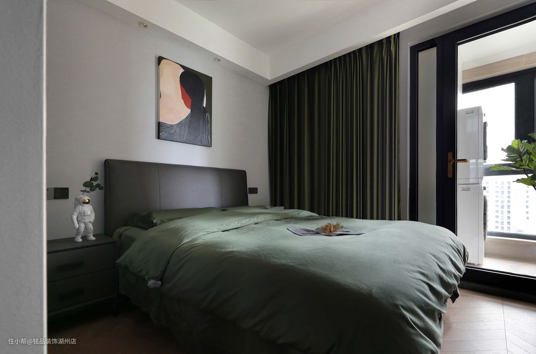 主卧采用鱼骨拼木地板搭配上一整面的超大落地窗,让空间得到充足的采光,而在一级吊顶的勾勒之下,营造温润而舒适的睡眠环境。