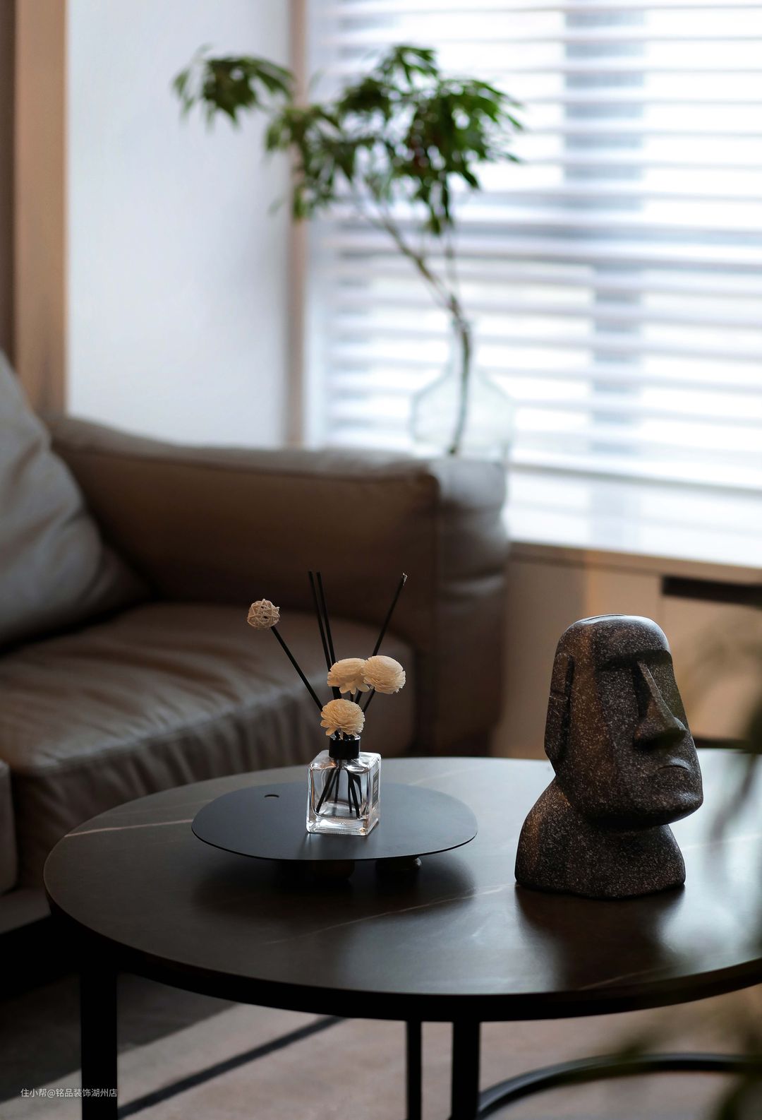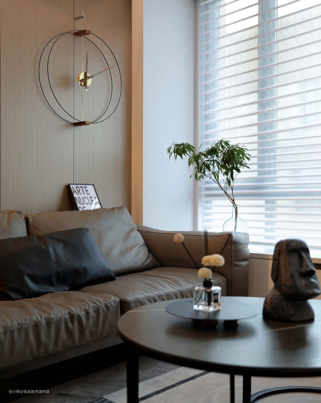 仿大理石黑色岩板打造的茶几呼应着深咖色皮质沙发,两者在木饰面的背景之下,使得室内的现代与静谧感更为浓烈。