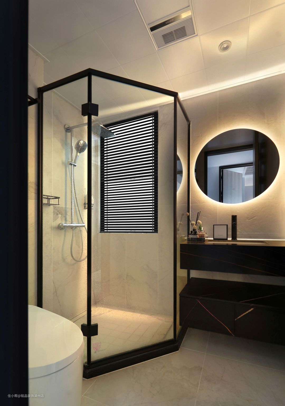独立的钻石淋浴房通过黑框玻璃门隔断分区,将室内的采光最大化,而且能够延展空间,扩展视觉效果。侧边的圆状镜以及暖光灯带在高级黑的大理石台面和收纳柜之间,彰显高级典雅的环境氛围。