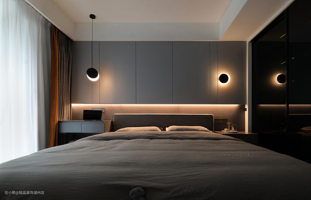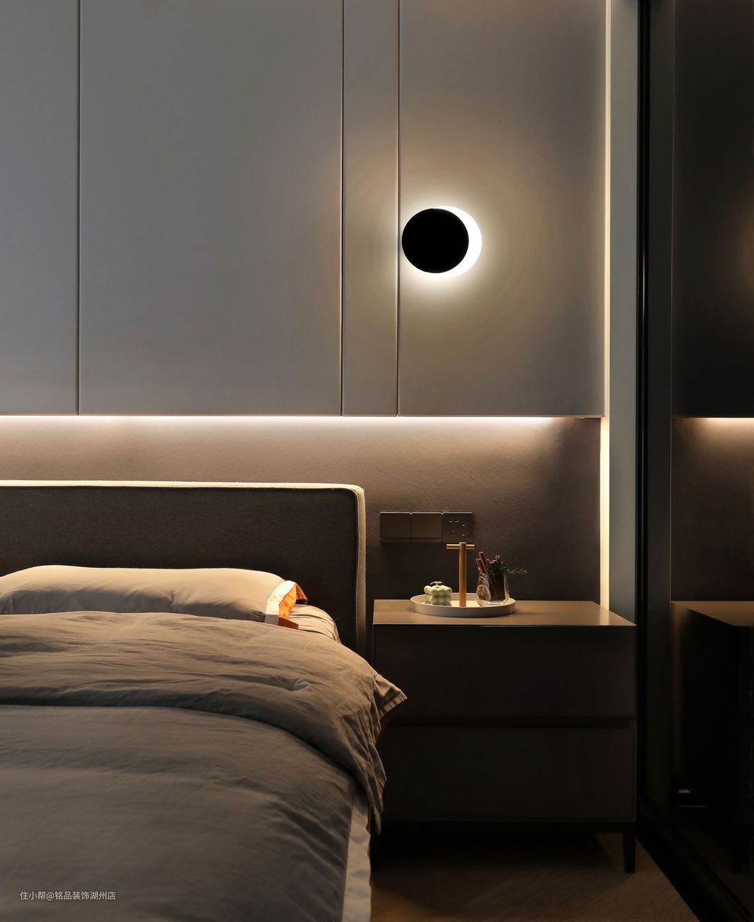 床头背景墙打造双层饰面,外侧设计半墙挑空深灰漆面墙板,此间辅以圆状内环壁灯与同元素吊顶,再融合贯穿一体的条形灯带,烘托出浪漫而高级的室内氛围。