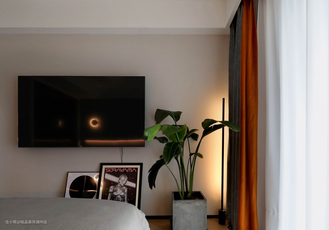 床头背景墙打造一整面的浅灰色乳胶漆饰面,再点缀一副冷暖色错叠的艺术画作,极简之中铺陈出独属于主人的静谧与安适。