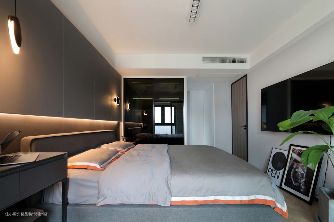 床体内侧设计一定到柜,搭配上黑玻推轨移门,在光影之中将室内的功能性展现出来。