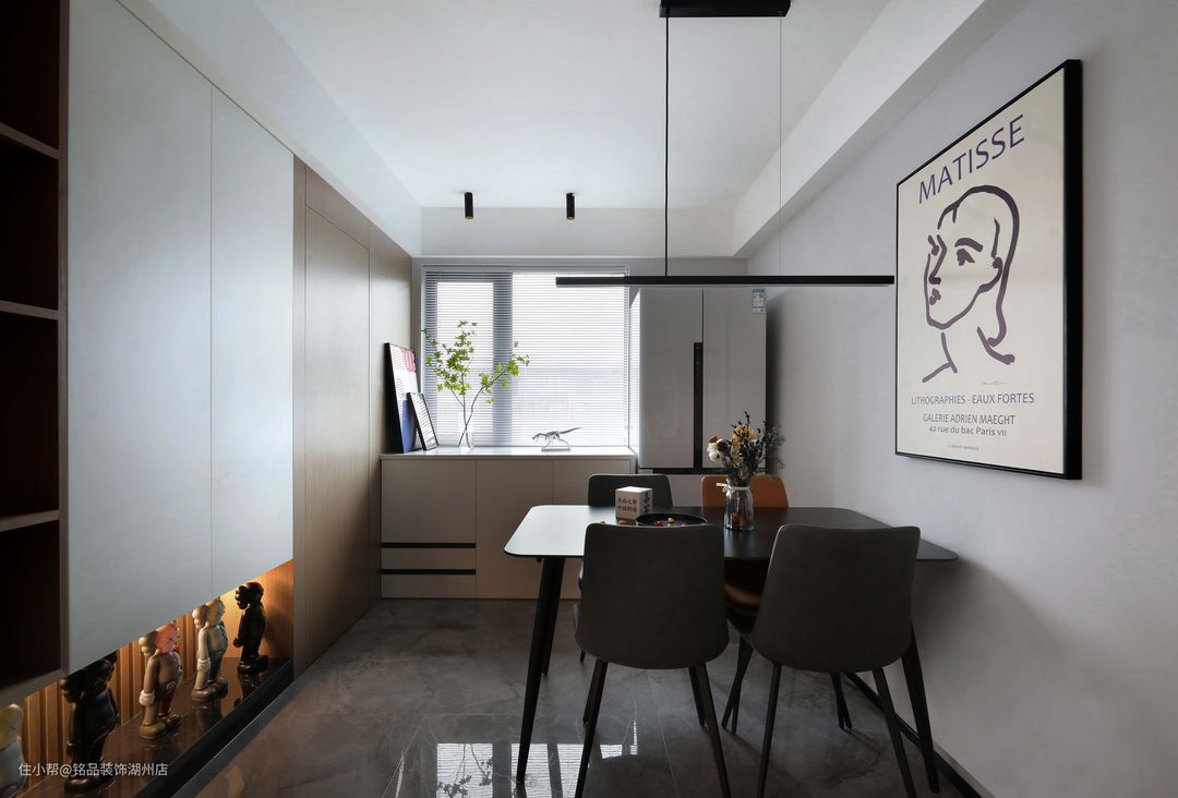 餐桌贴墙而立,空间尽头打造双开门冰箱摆放处以及窗台之下的半墙柜台,台面点缀绿植画作而柜体则满足收纳,两者共同将空间的视觉性和功能性兼容,达到最巧妙地室内设计理念。