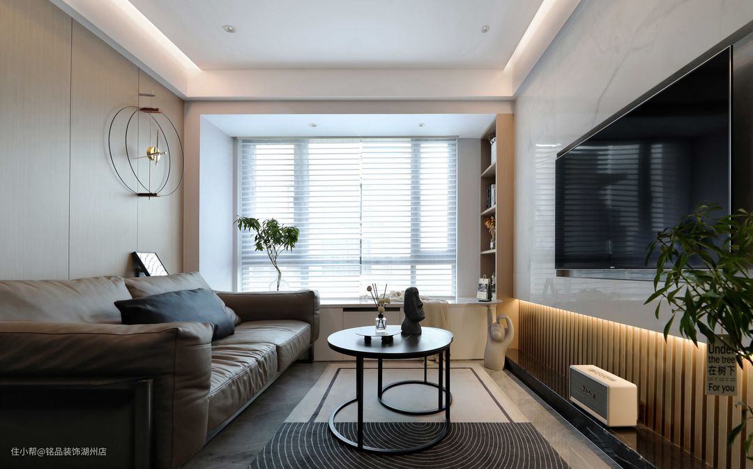 电视背景墙采用双层墙饰,外侧是一整面悬空式的鱼肚白大理石岩板,内侧则铺展木栅格,双层之间维系的暖光灯带营造出舒适怡人的氛围感,黑色亮面地台将整个空间延伸开去,点缀上绿植饰物,提升了全局的格调。