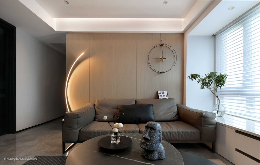 客厅沙发背景墙采用一整面的木饰纹理,点缀上半弧形的黑漆铝合金落地灯,由此而打造出的圆弧暖色光晕烘托出温馨而别致的居家氛围。