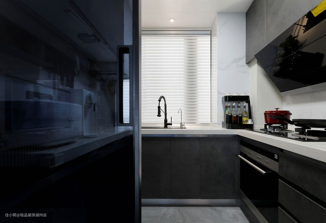 U型布局厨房铺贴浅灰色调大理石瓷砖,乳白色石英石操作台面贯穿一体,而吊柜与则与底柜呼应衔接,因而充分满足了空间的收纳需求,达到功能与外观的完美融合。