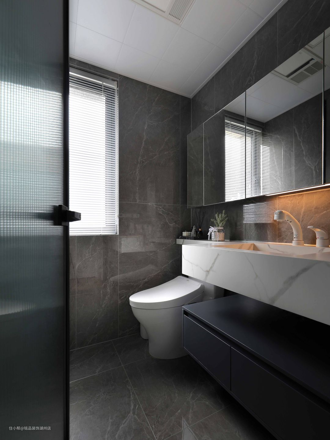 盥洗台采用悬空大理石台面,隔空打造黑漆磨砂质抽屉柜,搭配上三段式镜柜充分满足空间收纳需求。