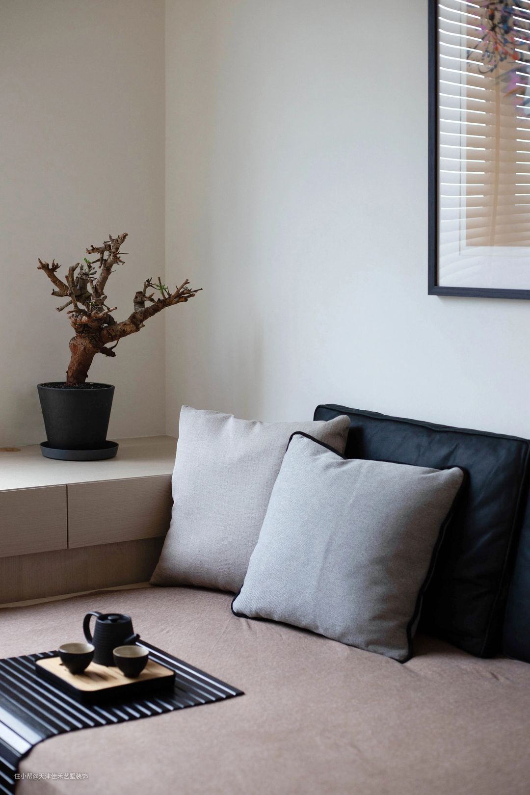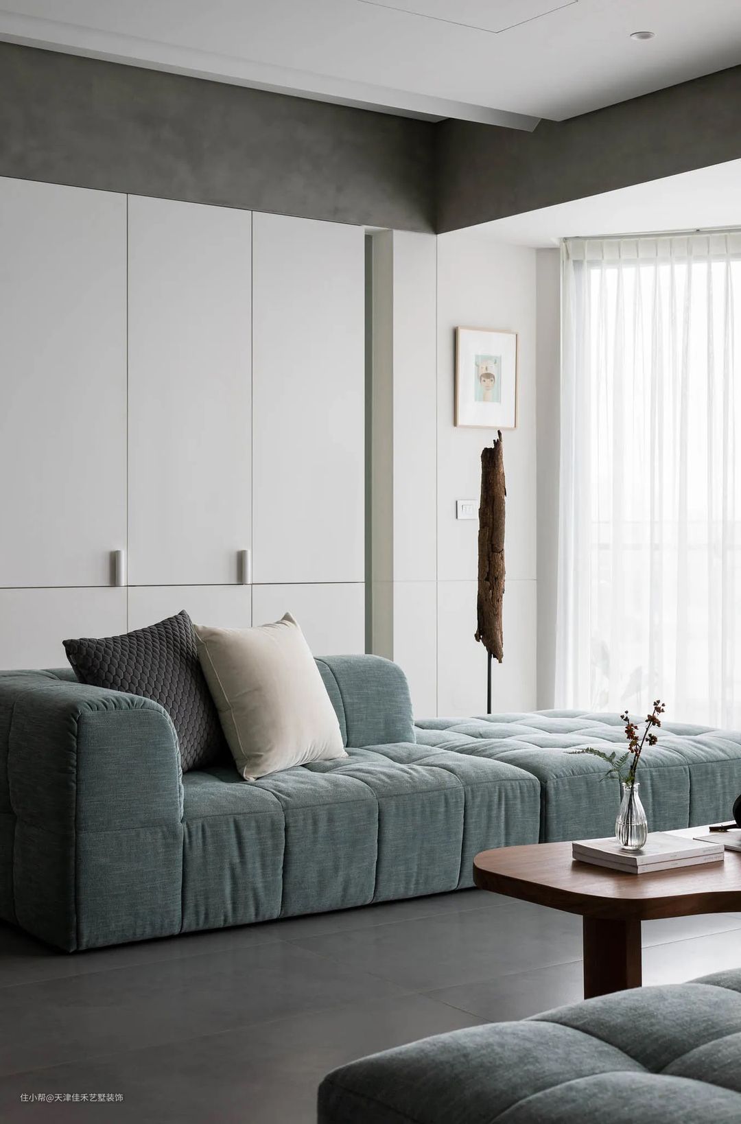 客厅地面选用了深灰色的地砖,仿水泥地面的工业风,既高级又耐脏,再搭配布艺沙发与木质茶几,硬朗与柔美兼具,时尚与温馨并存。阳光从落地窗轻轻的洒进来,照耀着墙上的装饰画,背靠柔软的沙发,一杯清茶+一本好书,还有那树干造型的艺术装饰物,满满的文艺氛围。 #客厅#地砖#沙发#茶几#落地窗#装饰品