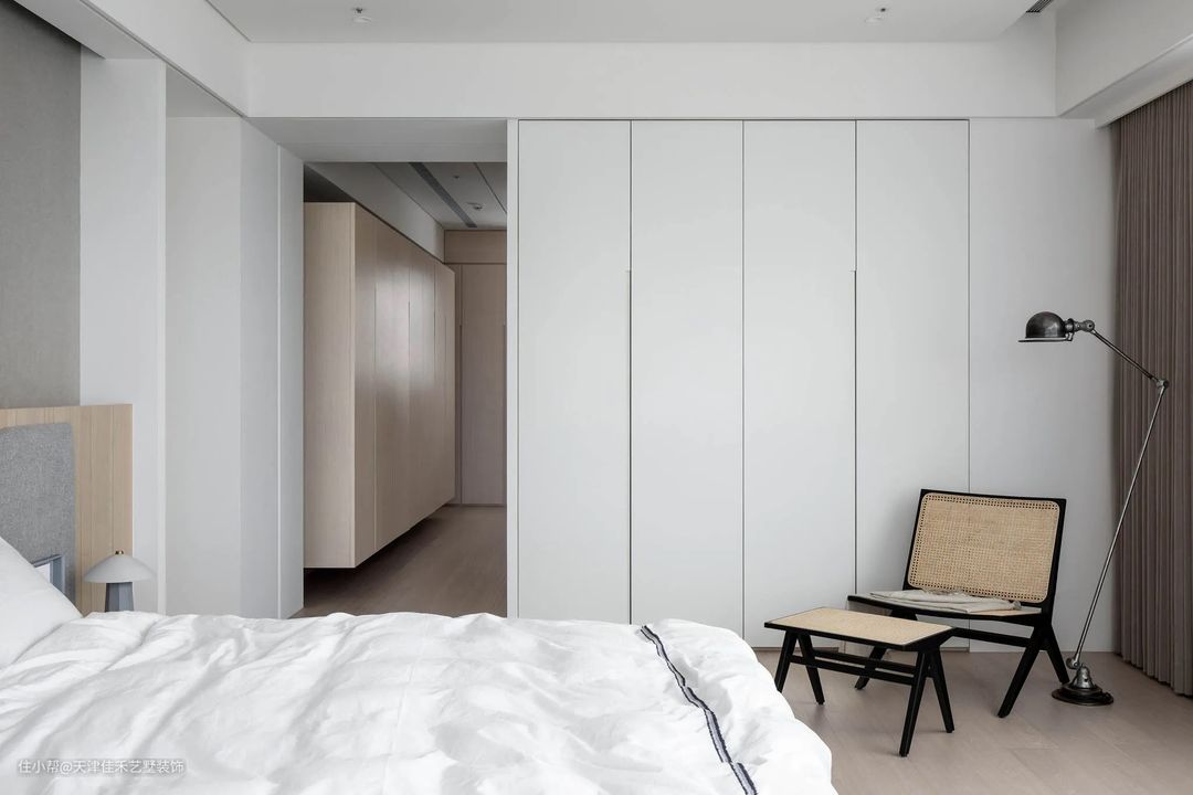 主卧的其它墙面仍然沿用了客厅包墙的处理方式,衣柜与墙面形成一个整体,既扩大了储物空间,又保持了整洁的外观。角落里的小躺椅和落地灯,又为简约的空间增添了一份艺术气息。 #卧室#衣柜#躺椅#落地灯