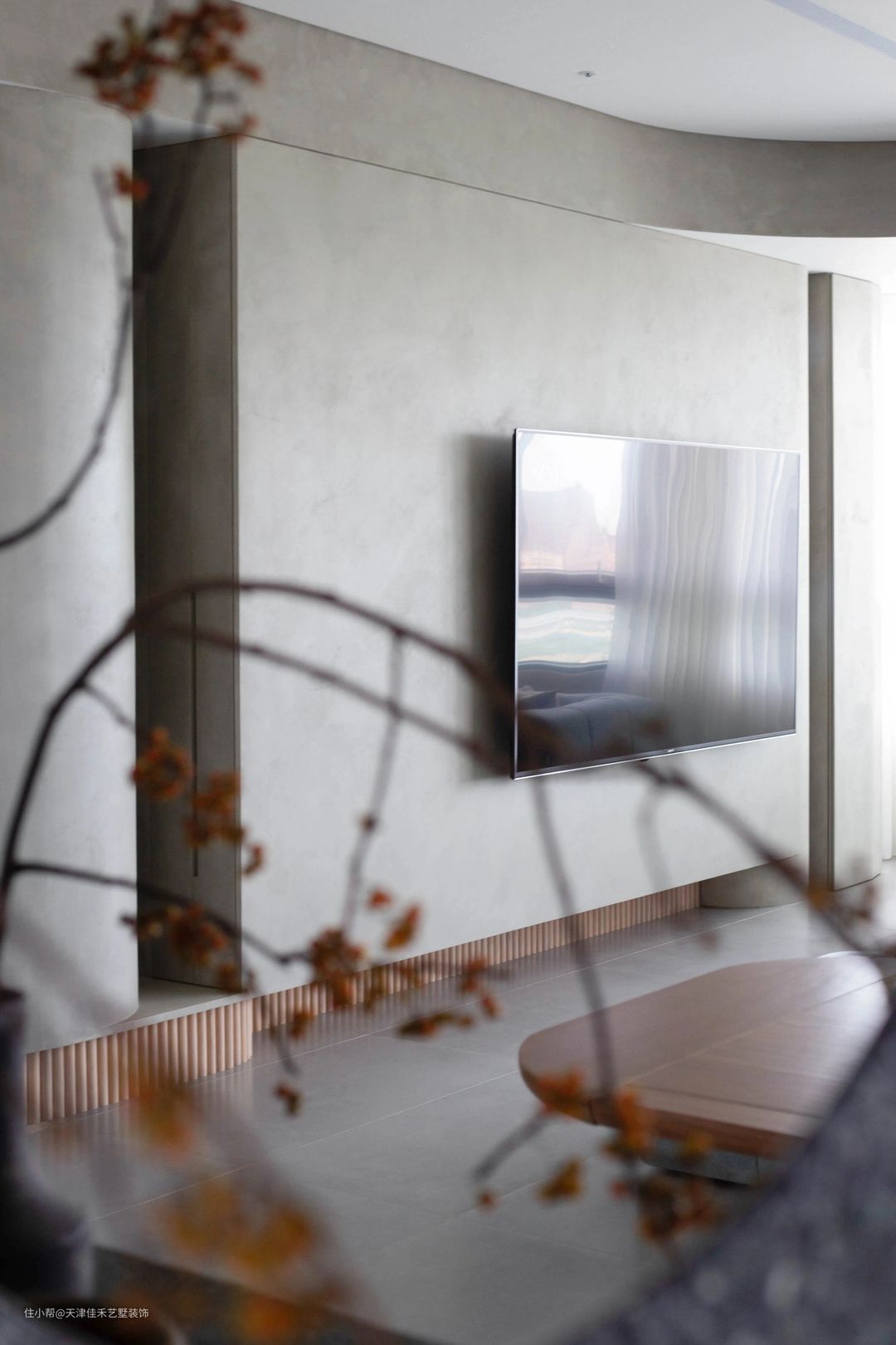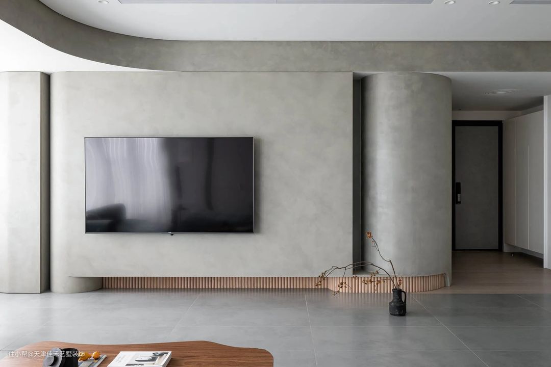 电视墙使用了与地面呼应的灰色包墙处理,分为左、中、右三个部分,每个部分采取了不同形状的造型,让人不至于长时间观看产生视觉疲劳。尤其是电视墙底部的镂空设计,配合短木条的装饰贴脚线,有点抽象的柴火堆的意味,原木的色彩在厚重的灰色墙面上,植入了一股清新的自然元素。 #客厅#电视墙#贴脚线