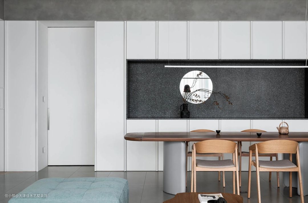 餐厅选择的是木质台面的长餐桌与木质座椅,与客厅的木质茶几形成呼应,强化了统一性。对面墙体定制了餐边柜,还做了中间镂空的处理,黑色的磨砂背景,搭配圆镜,宛如一轮夜色中的明月,让整个就餐区域居然透露出一丝隐约的禅意。 #餐厅#餐桌椅#餐边柜#背景墙