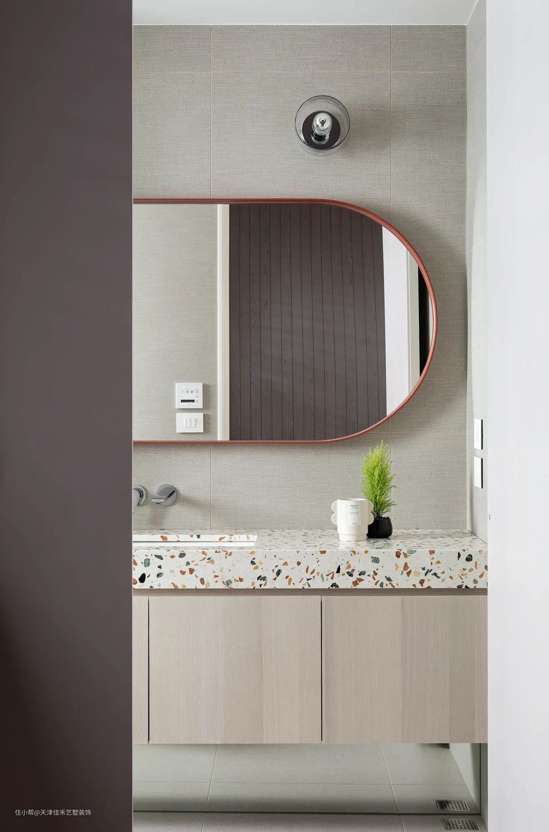 卫生间洗漱区的台面选择了具有彩色斑点的石材,梳妆镜也采用了更具亲和力的圆弧造型,很容易让人产生一种愉悦的轻松感。 #卫生间#洗漱台