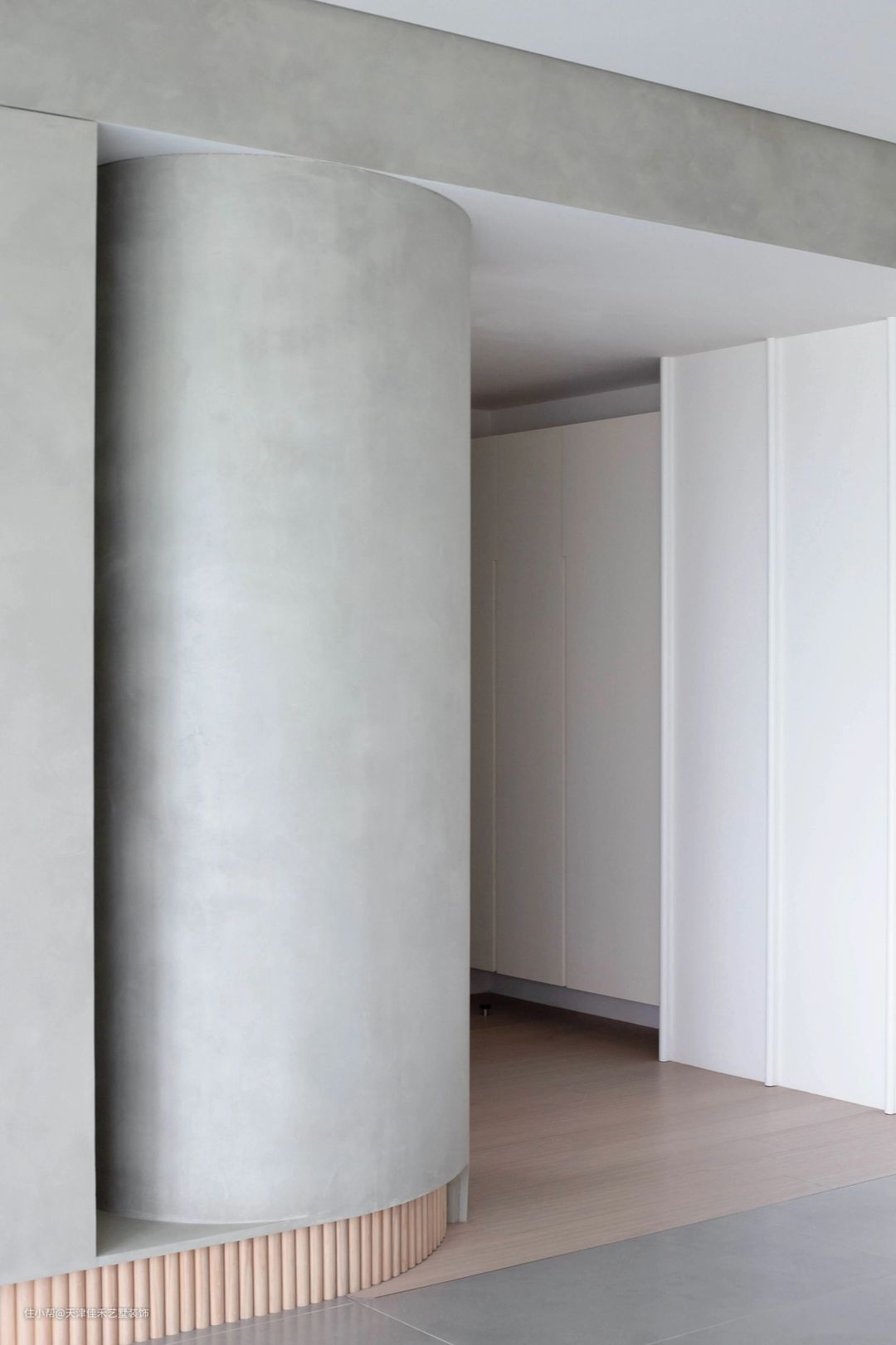 电视墙一侧粗大的圆柱体造型,不仅显得大气磅礴,具有艺术气息,而且与对面的墙体形成一条隐秘的通道,增加了玄关通道的纵深,充分保护了其它房间的私密性。 #客厅#电视墙
