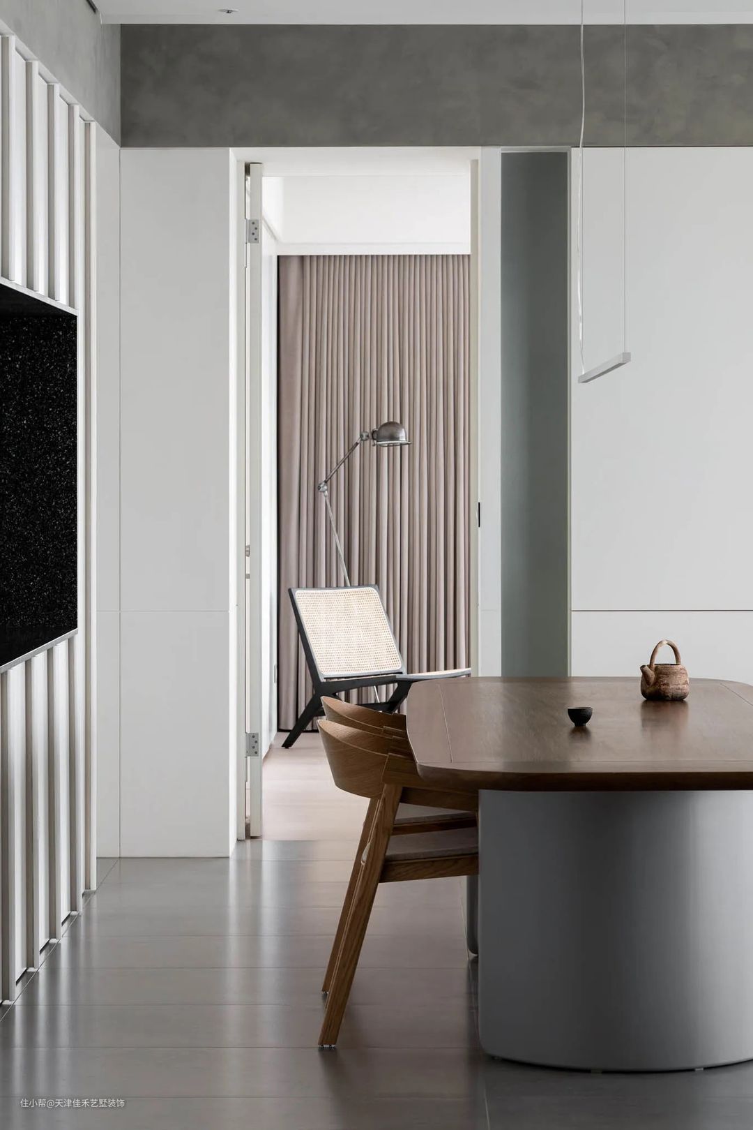 餐桌的底座是与地板相近的灰色材质,深褐色的木纹桌面,搭配原木座椅,再摆上一副和风茶具,瞬间提升了生活的文艺格调。 #餐厅#餐桌#餐椅#茶具