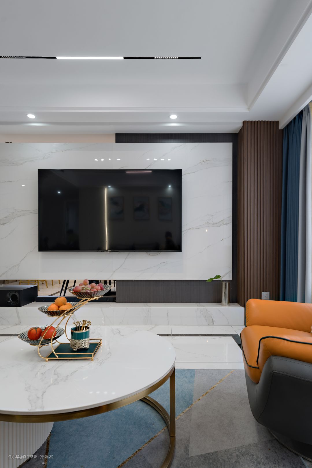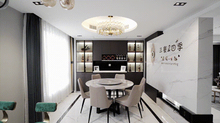 电视背景墙的另一面作为了餐厅的背景墙,“三餐四季,温暖有趣”,金属字体与温润岩板相得益彰,打破空间单一感,为家注入灵动特性,也表达了居者对于美好生活的无限向往。