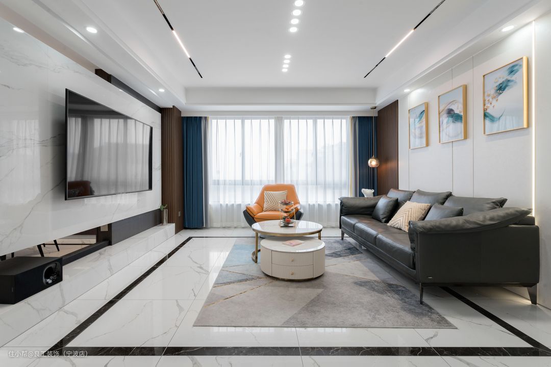 客厅撇弃了复杂的线条构造,从吊顶到墙体都维持了最简约的线条。将原有的飘窗敲掉,拓宽室内面积,增强采光度。