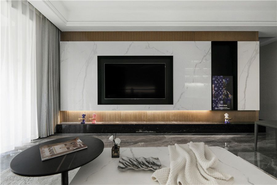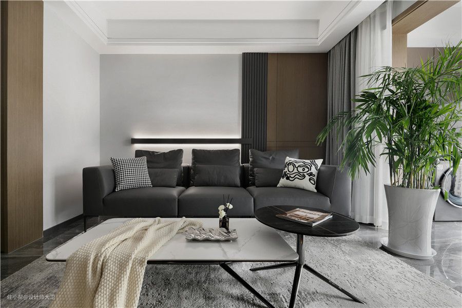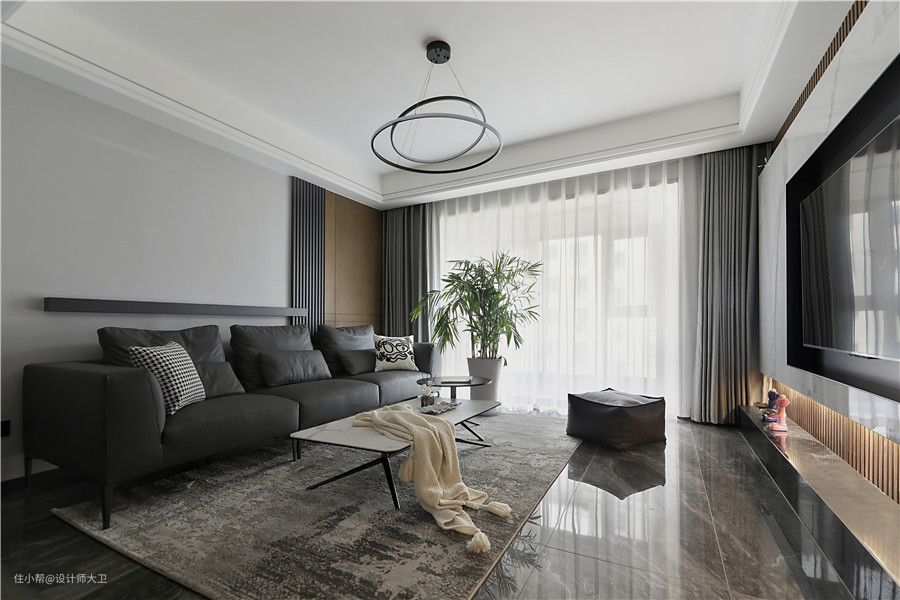 黑色皮质沙发凸显了空间的现代感觉,墙面黑色木栅加木饰面做造型,层次分明呼应。