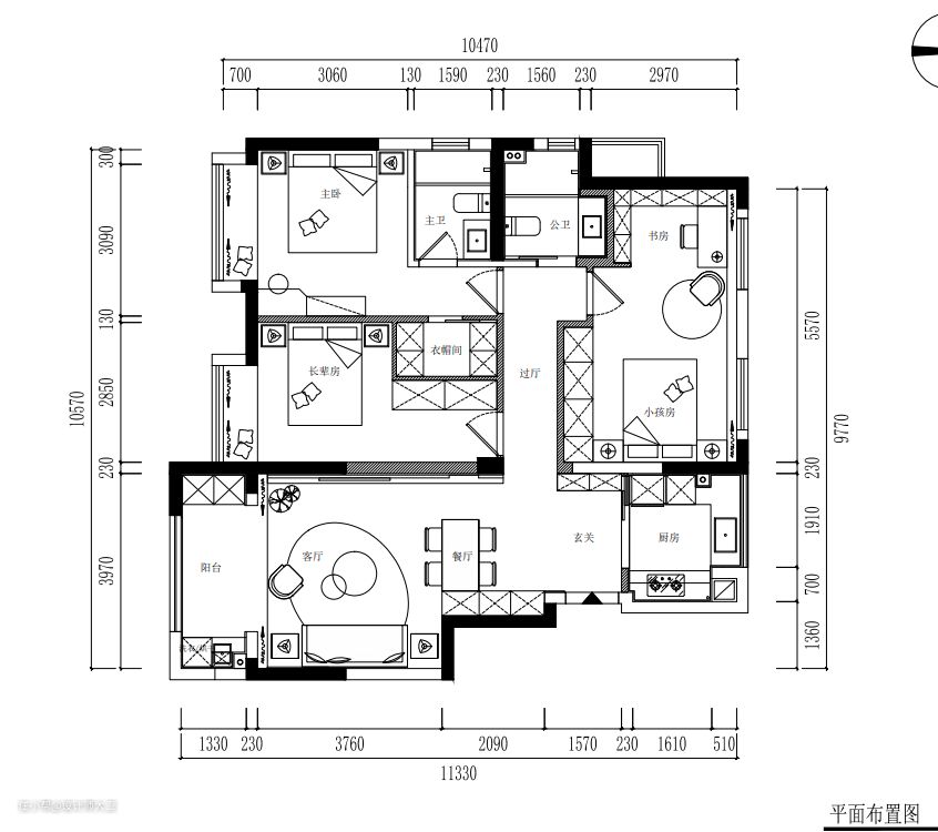 客户喜欢现代黑白灰+轻奢。第一次见面的时候,由于客户对自己的需求很茫然,加上客户时间紧,导致客户和我没有聊到一起去。男主人是比较注重工艺的,自己去我们工地参观之后,主动联系我们,我们再次去到客户房子那边碰面沟通。经过上次的大致了解,我发现客户非常注重小孩的成长空间,原先开发商保留的书房空间主要也是提供给小孩使用。于是我把北面两个卧室打通,变成小孩房+书房这样的卧室套房,这个方案让客户眼前一亮。