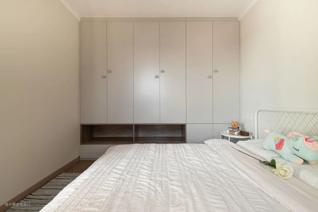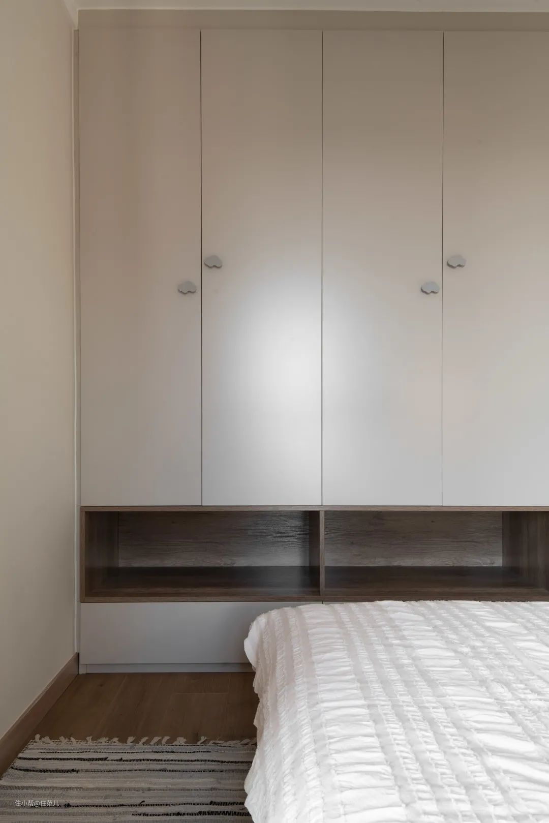 用一面墙做了整墙定制柜,考虑到将来可能会有小宝宝,增加了云朵把手的可爱元素,还预留了两个开放格,搭配储物筐放玩具非常合适。