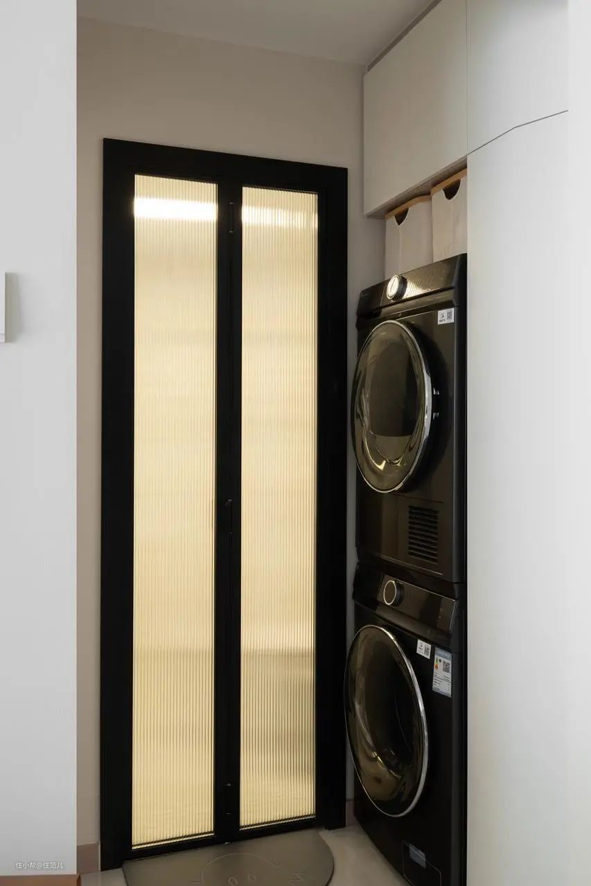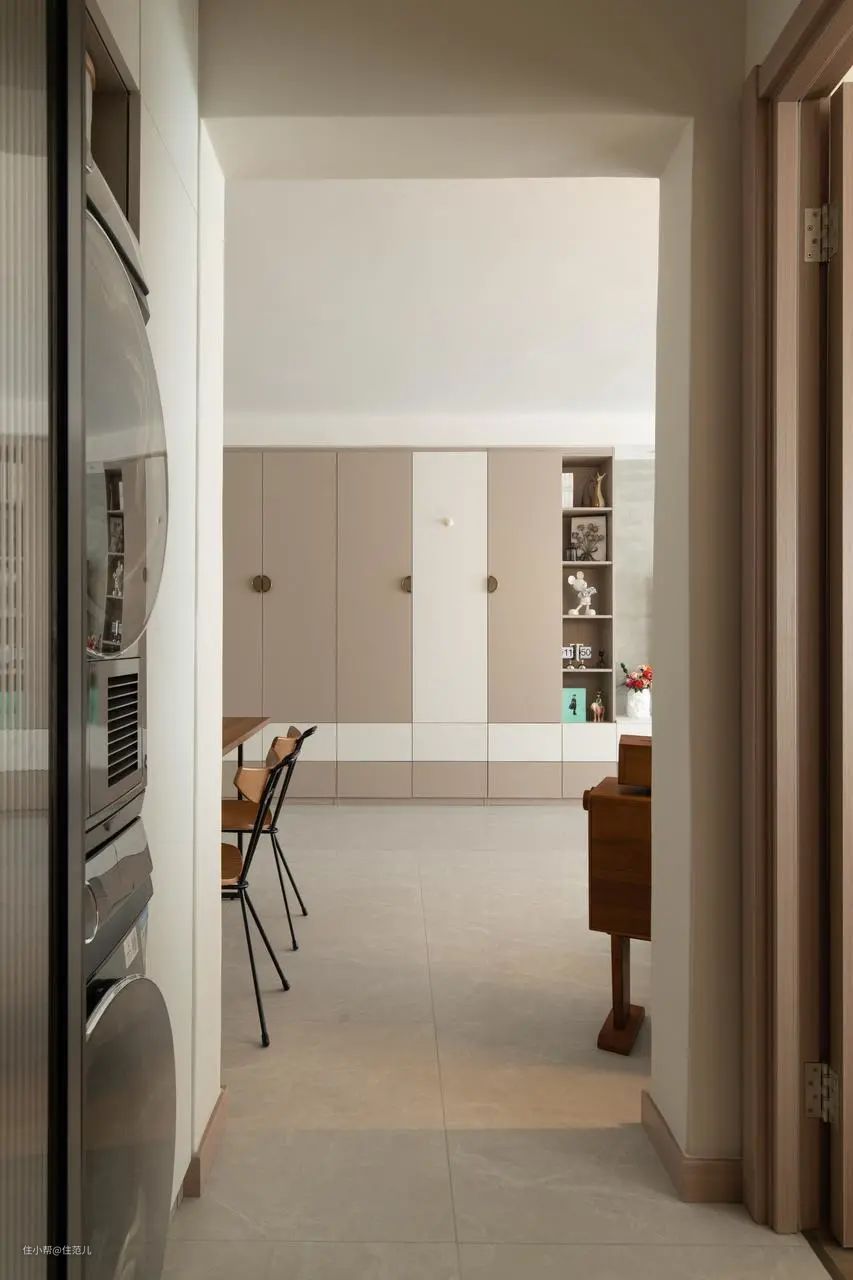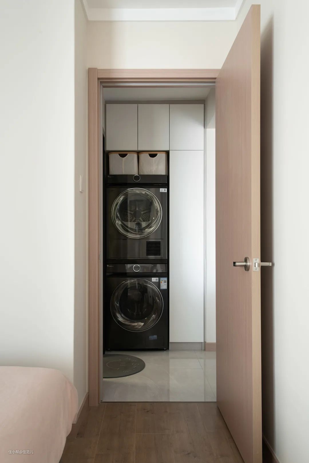 设计师在卫生间外做了洗衣区,叠放洗衣机和烘干机,每天洗澡换洗下来的衣物直接丢进去,动线非常合理。 因为日常只有两人居住,两人生活规律,家里鲜有抢卫生间的情况发生,洗手台外置不是刚需,而洗衣机+烘干机的配置,解决了晾衣的问题,解放了阳台空间。
