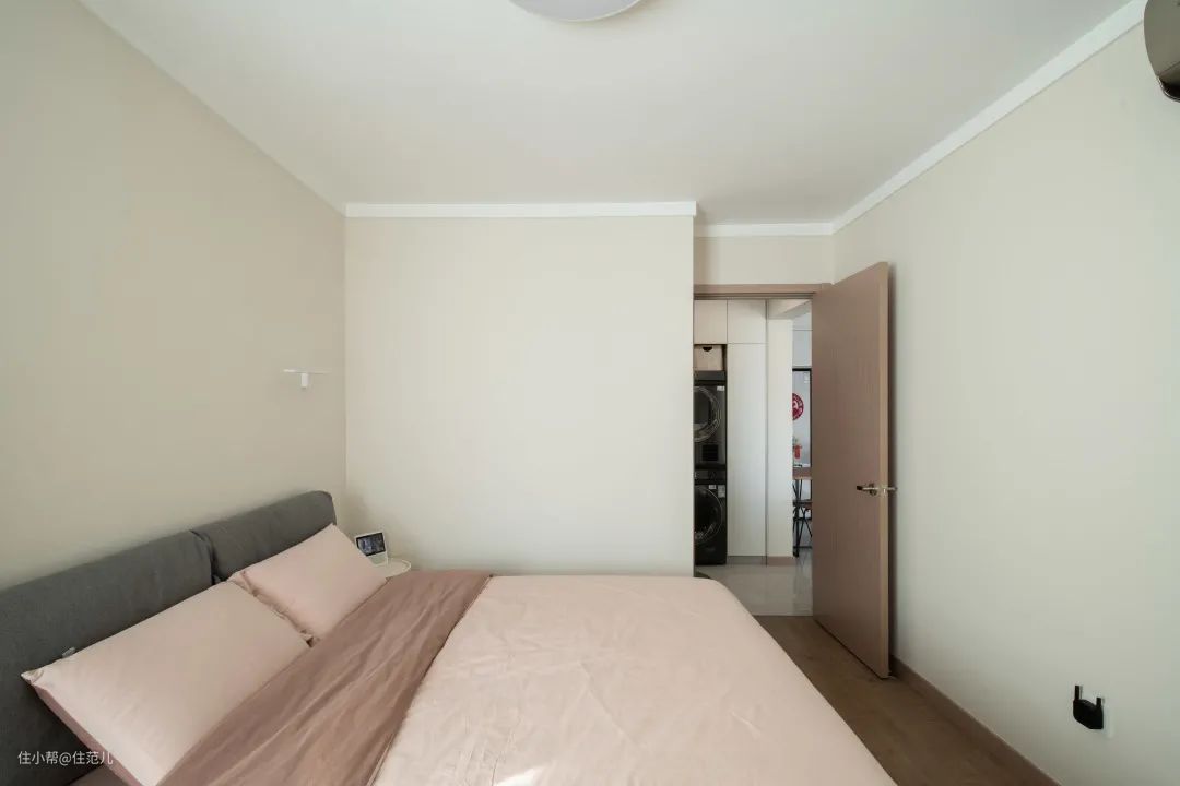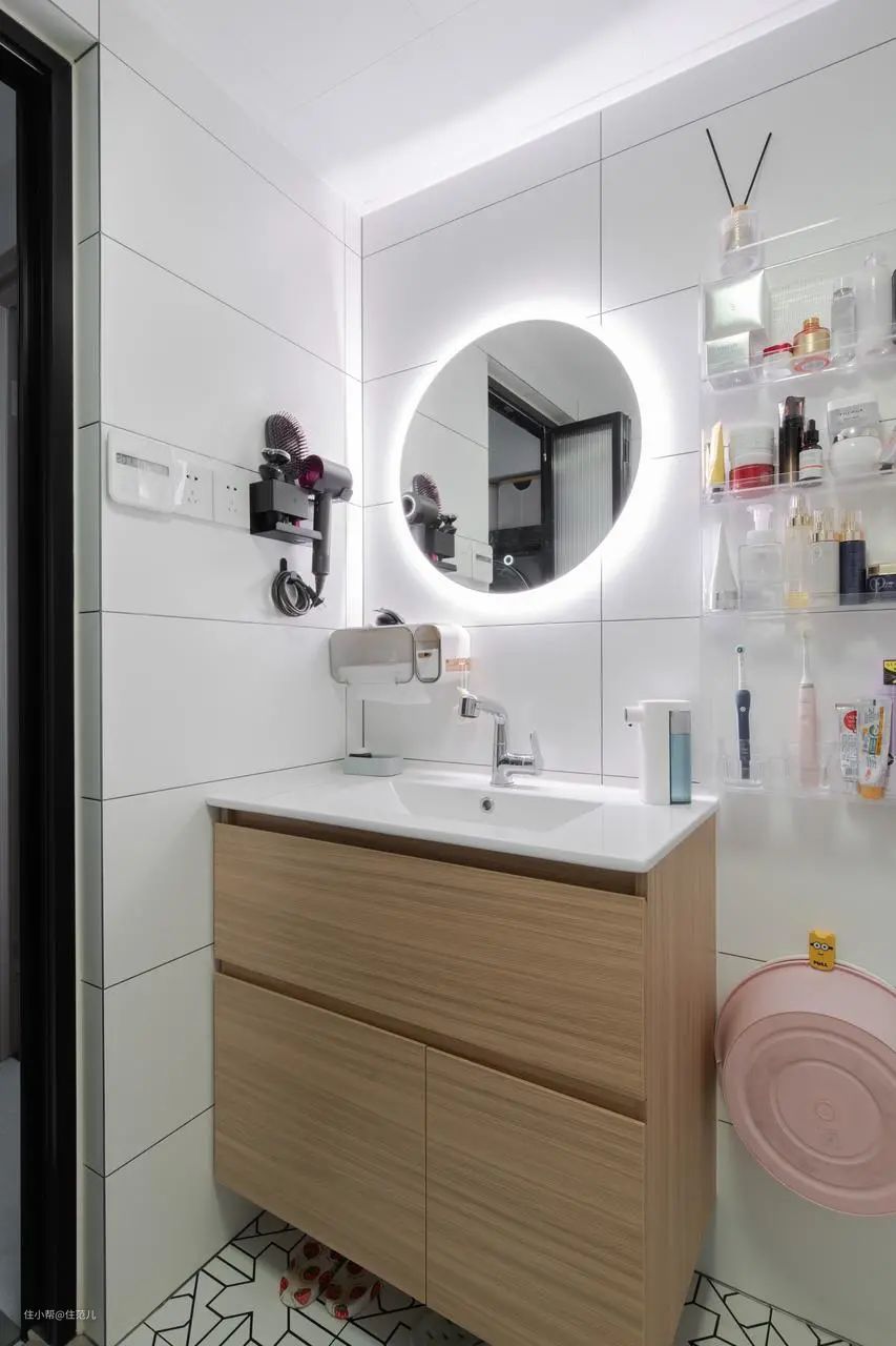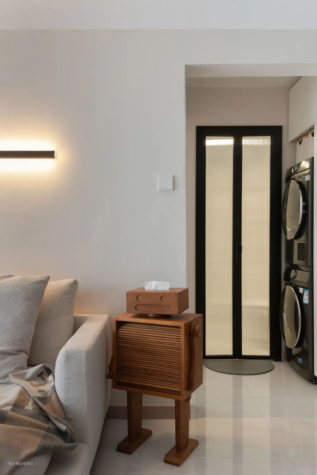 设计师在卫生间外做了洗衣区,叠放洗衣机和烘干机,每天洗澡换洗下来的衣物直接丢进去,动线非常合理。 因为日常只有两人居住,两人生活规律,家里鲜有抢卫生间的情况发生,洗手台外置不是刚需,而洗衣机+烘干机的配置,解决了晾衣的问题,解放了阳台空间。