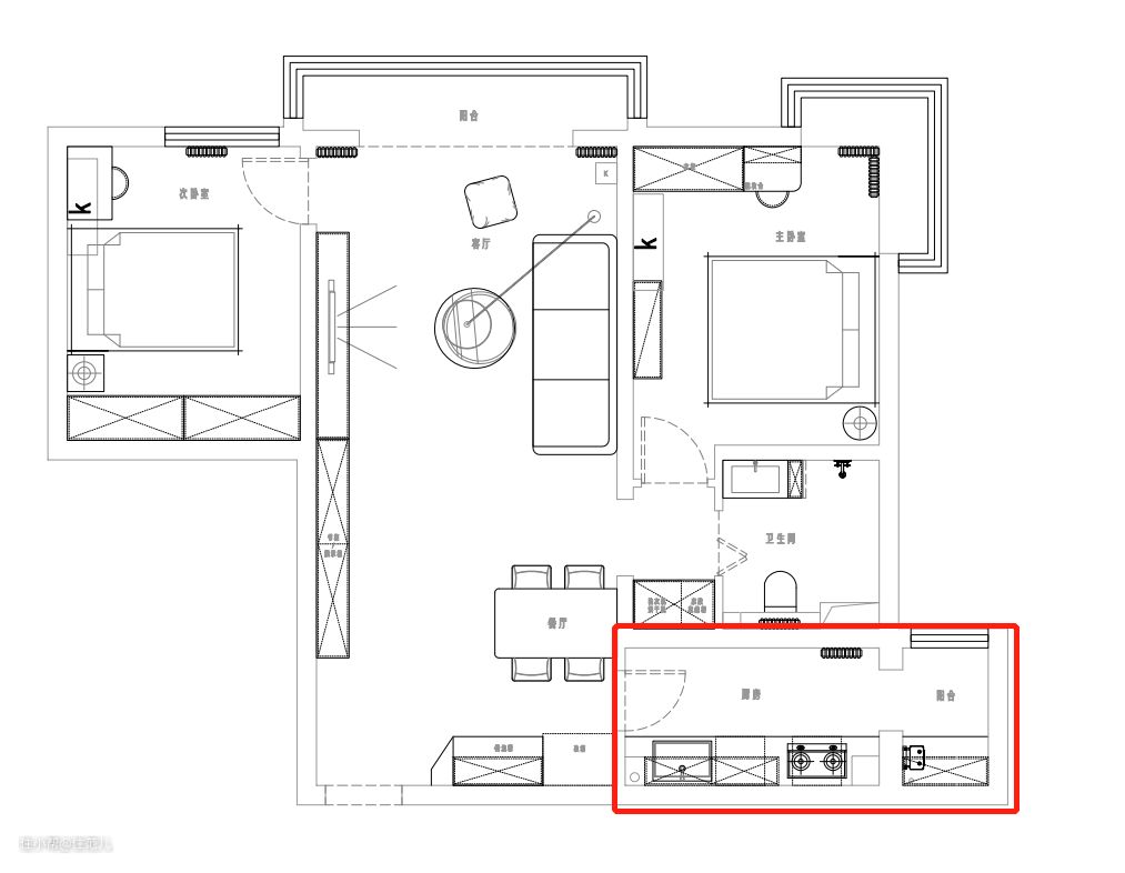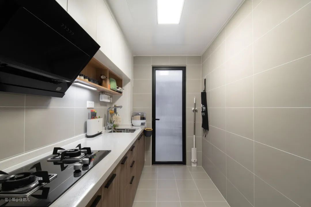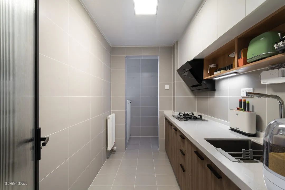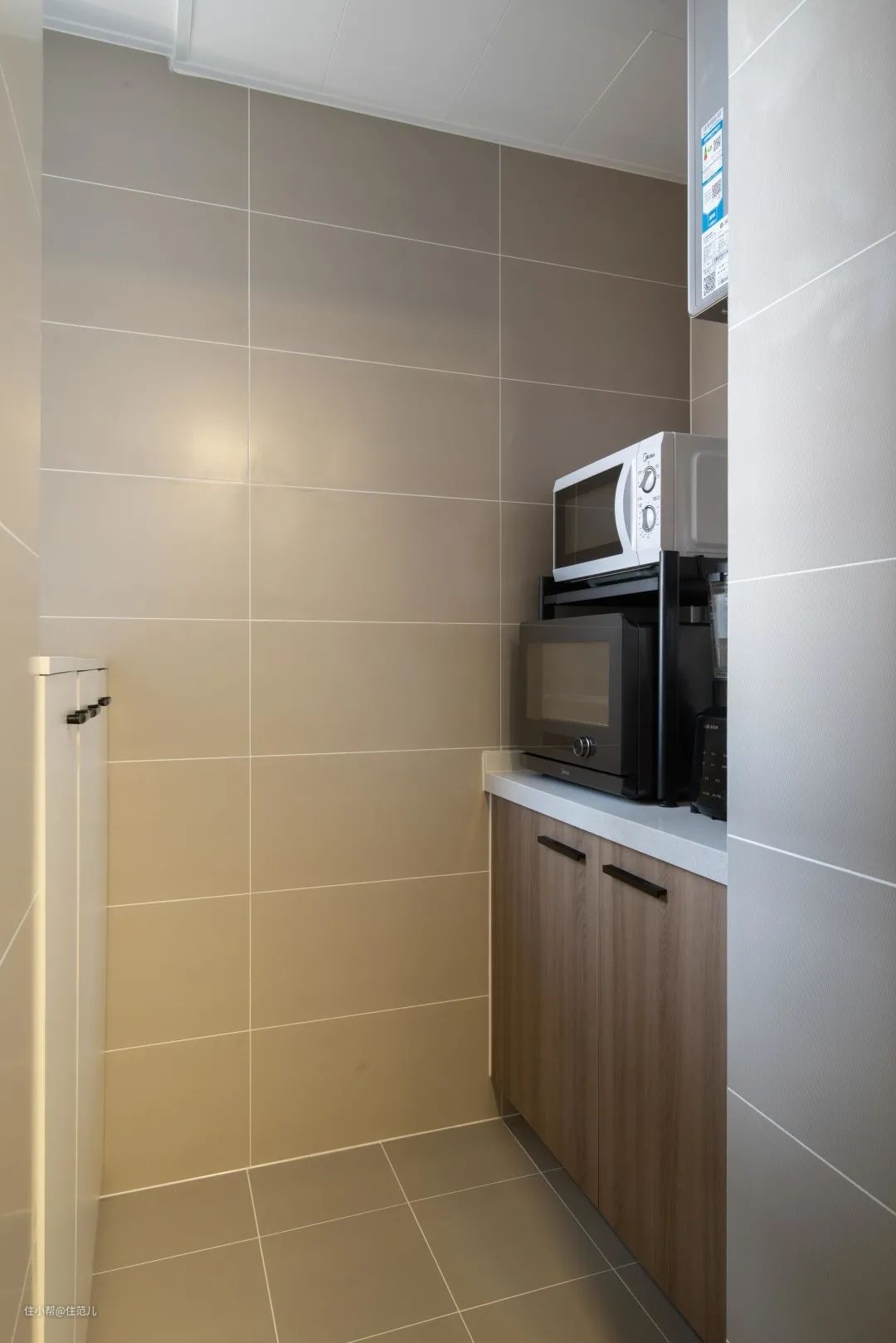 把生活阳台纳入厨房,得到比较充足的操作空间,蒸箱、烤箱、破壁机等小电器都放在阳台上,可以看作比较另类的中西分厨格局。