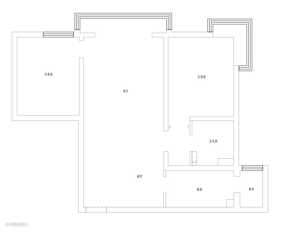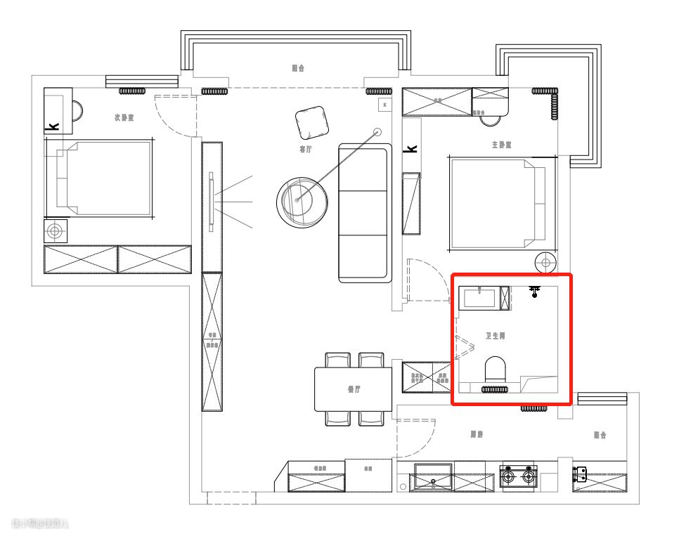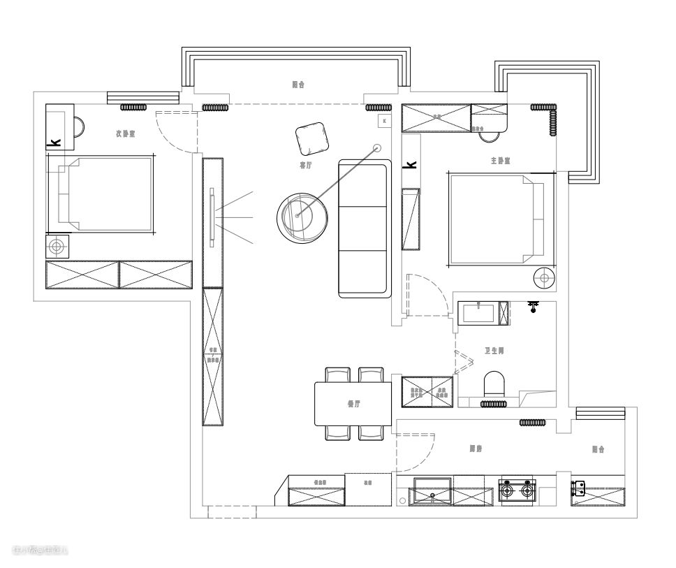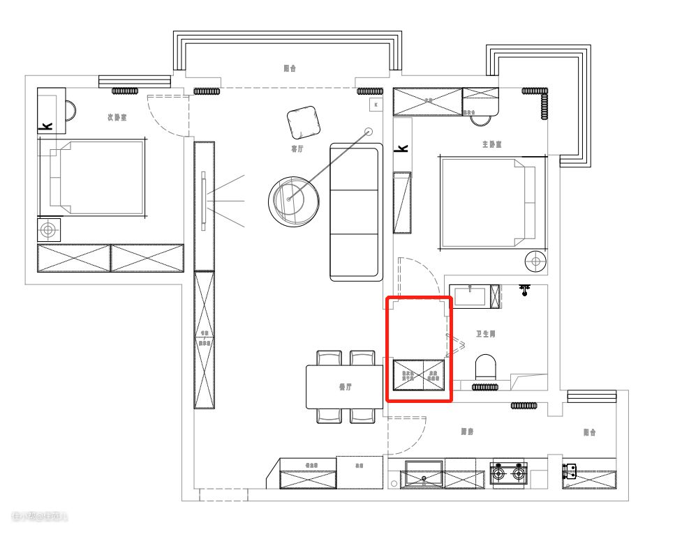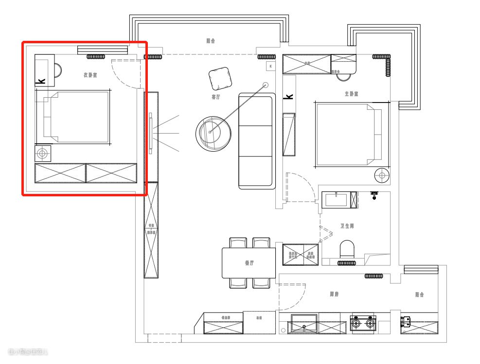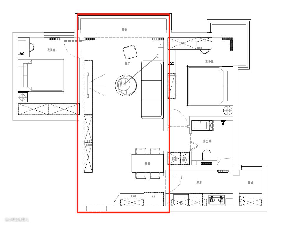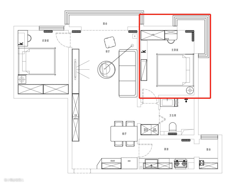 原始户型房间比较方正,西南朝向虽然不通透,但窗户足够大,室内空气流动性并不差。 ▼改造后