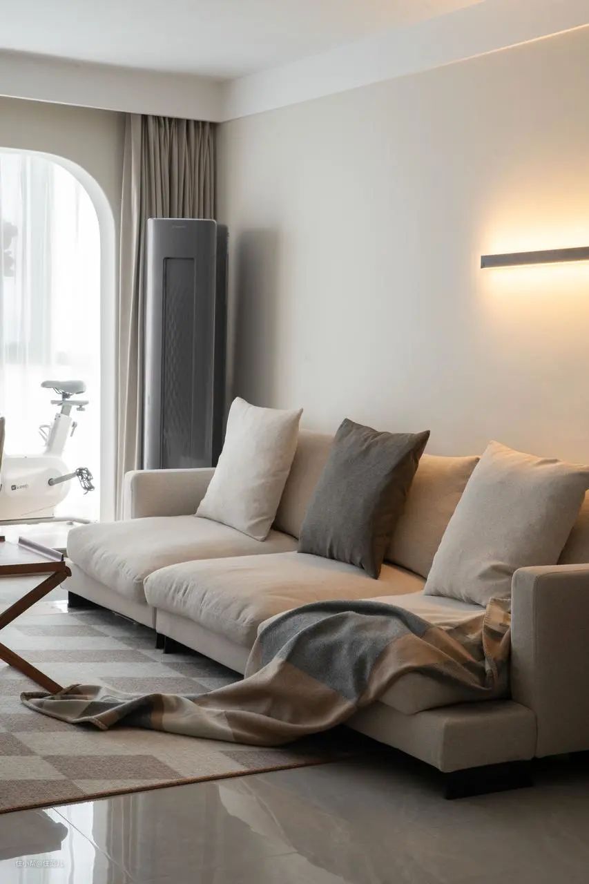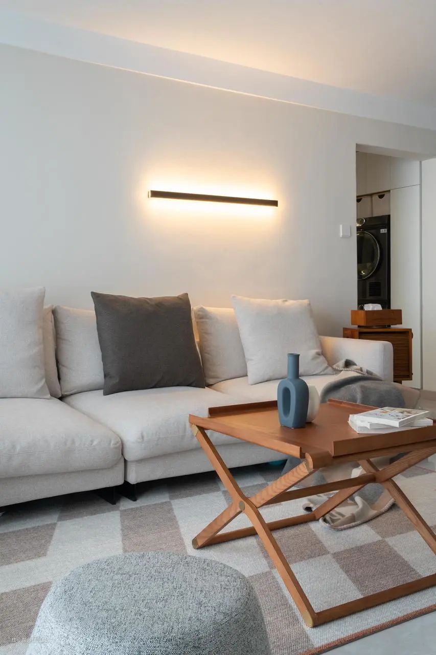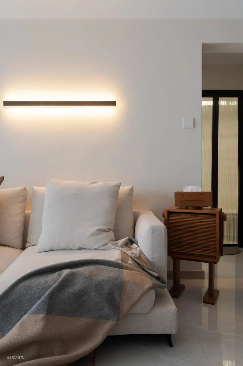 布艺沙发高度和坐深都很合适,沙发上方的线型壁灯光色偏暖,是客厅里的气氛担当。