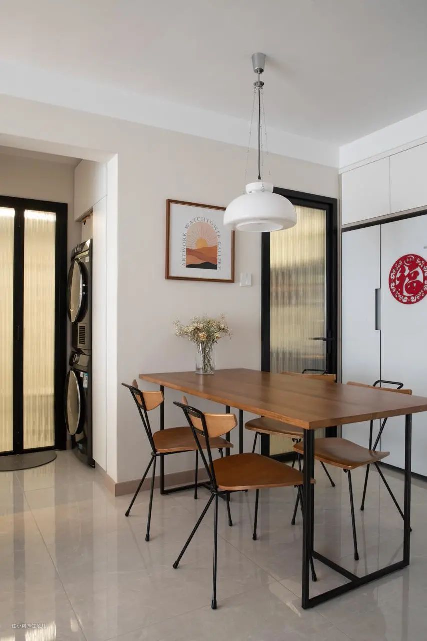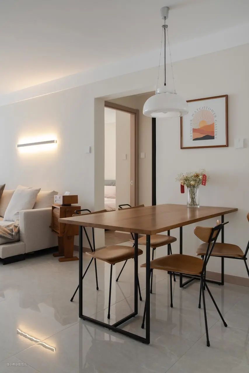 首先来到餐厅,餐桌是女主选的,纤细的铁艺桌腿加上温润的实木桌面,搭配灵巧又不失硬朗的餐椅,为空间注入几分工业元素的随性气质,和现代风格的装修形成柔和对比。