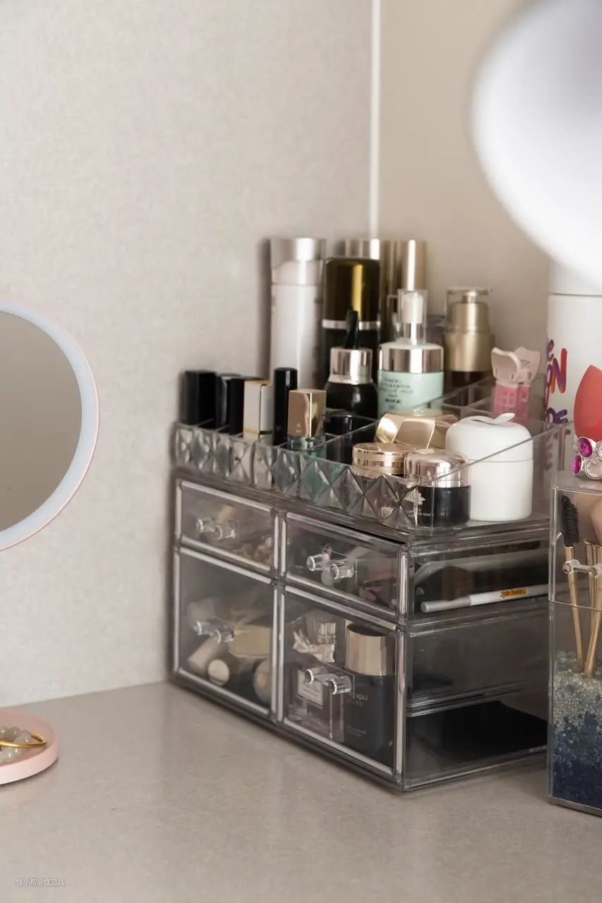 梳妆台上的亚克力收纳盒跟了女主多年,零碎的彩妆、工具全都收进去,化零为整。 旁边摆了一幅女主手绘的自画像,女主并没有学过画画,只是单纯爱好就能画这么好,也是很厉害了!