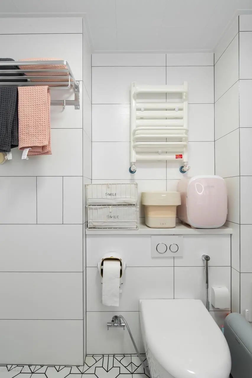 洗衣区预留出洗衣机和烘干机的尺寸,剩余空间做定制柜,放置日常备品囤货,女主淘到两个严丝合缝的收纳筐,放在缝隙处,就如量身定做一般,很好的利用了鸡肋空间。