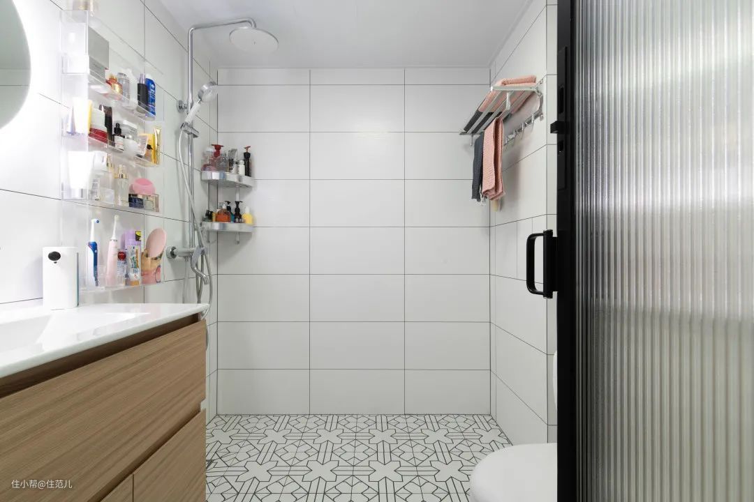卫生间和厨房都用了长虹玻璃门,直角边框凸显了现代风格,简洁大气。 不同的是,卫生间用折叠门,更省空间。 以大量的磨砂白色为底,卫生间给人整洁又明亮的感受,花砖图案地砖几何感很强,给空间带来一些分量感,避免过于轻飘飘的。