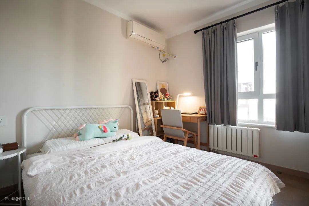 次卧居住的频率很低,屋主选择了价格实惠的宜家奈斯顿铁艺床,床头柜同样使用宜家边几替代,性价比很高。