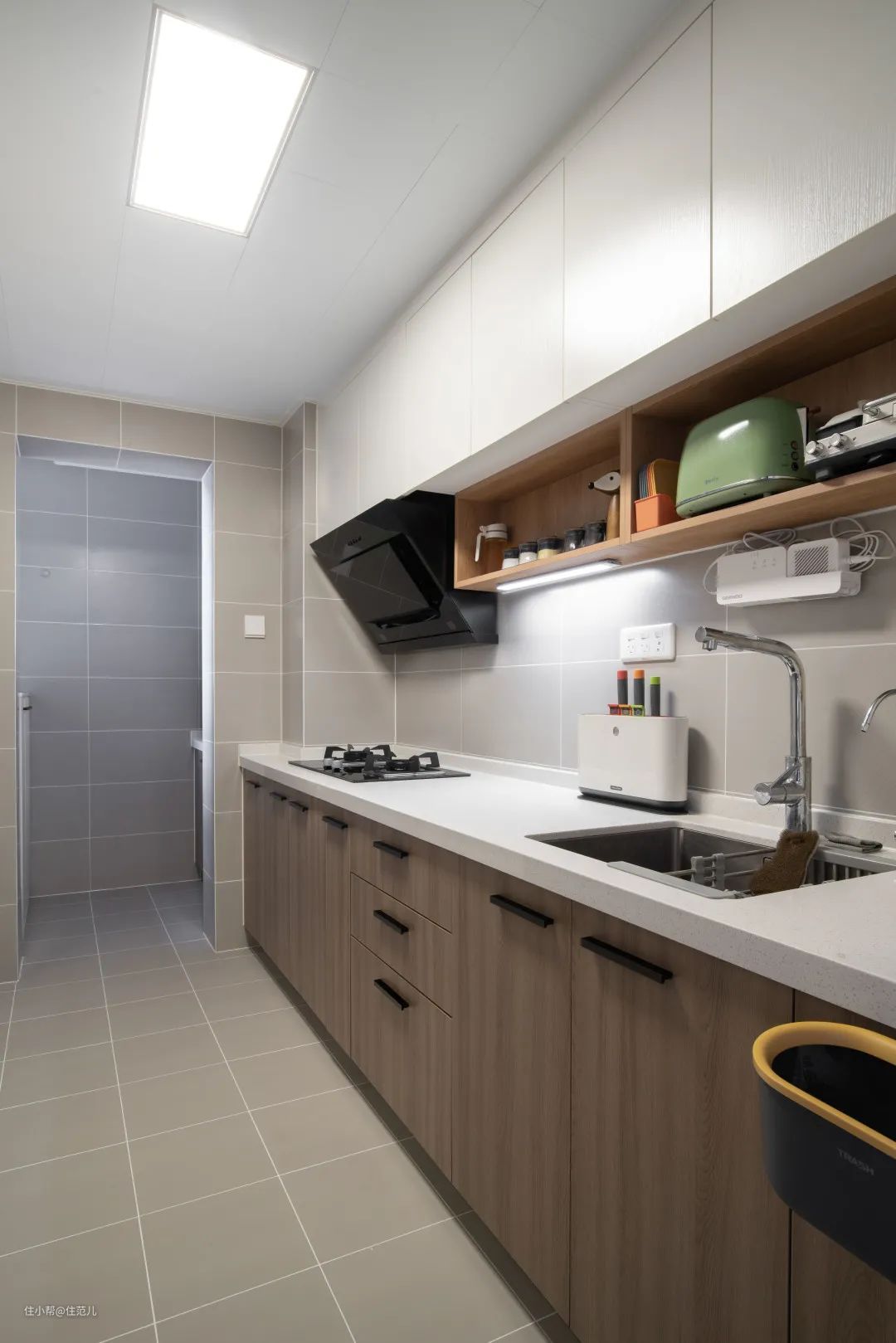 吊柜下方设计了一排开放格,经常使用的调料罐、餐垫、多士炉妥帖安置,解放了台面空间。