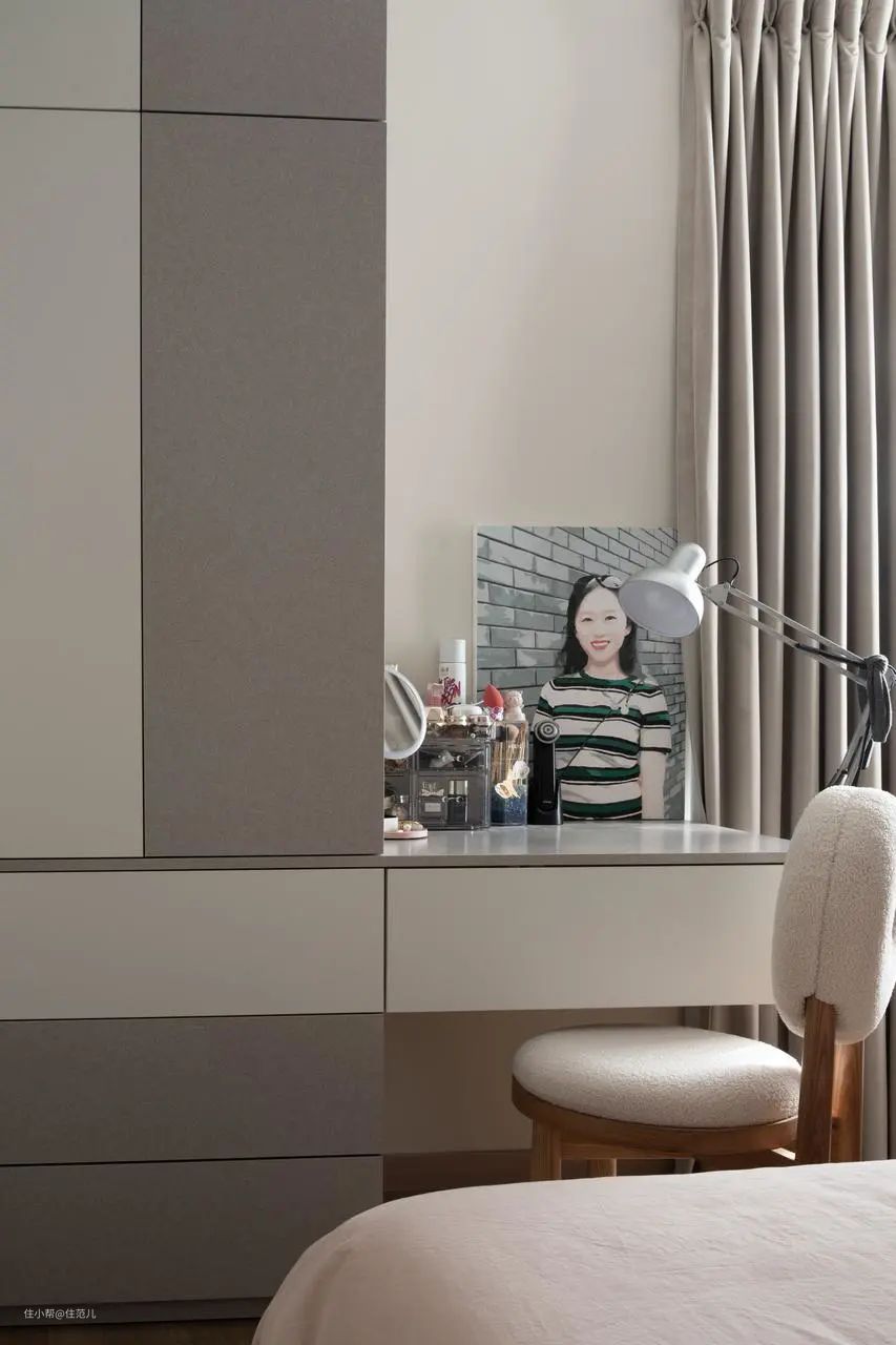 定制柜延续了客厅的配色和造型,柜体延伸成为梳妆台,美观又实用。