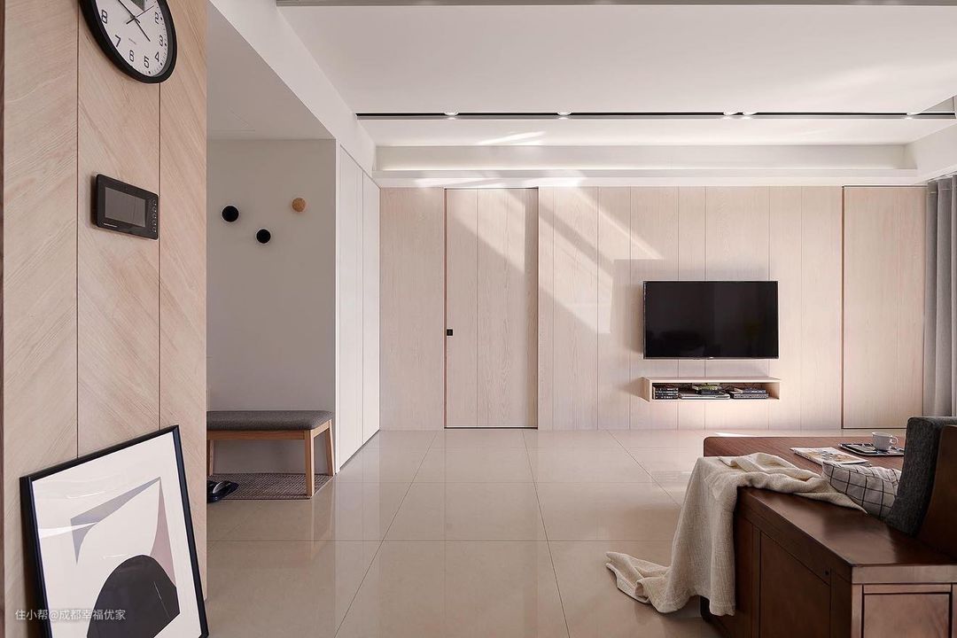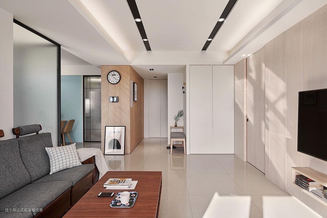 整体是现代简约的风格,双眼皮吊顶,中间添加嵌入式筒灯灯轨,墙面使用了无缝墙布,在电视背景墙的位置左边是一个嵌入式柜体,柜门选择了隐形柜门,进行客厅物品收纳,左边是次卧的入室门,同样选择的是隐形门,在空间变得更加统一。