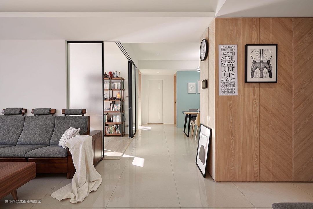 总的来说横厅是比较长的,因此增加了一个书房的空间,使用玻璃磨砂门,与墙体做结合,增加了沙发背景墙的面积,这里的墙面是喷涂的白色乳胶漆,后期如果想要去掉门框进行改造会比较方便。阳台是纳入了客厅进行设计,因此收纳柜的位置也直接放在了靠窗的地方,顶部悬挂了一个挂式空调。
